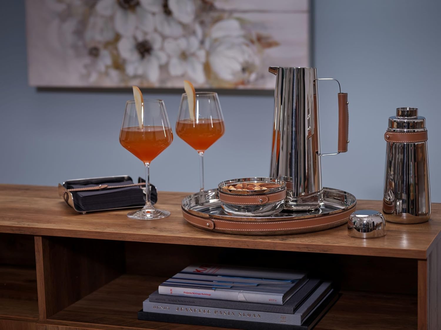 - THE TAHOE COLLECTION: A sleek and modern stainless steel barware collection, Tahoe blends high shine and rich brown leather for a strikingly refined design.