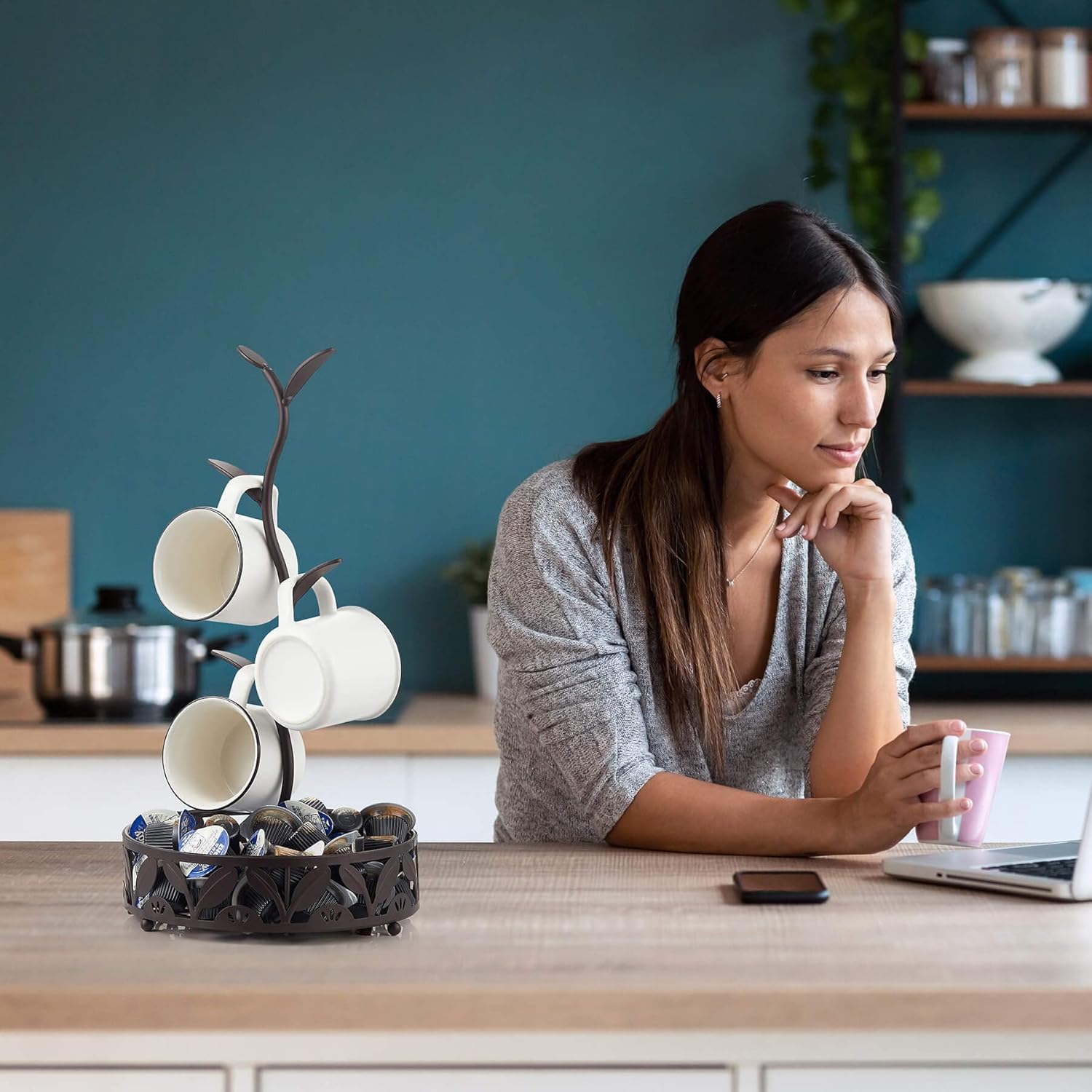 - 【Space Saving and Organized】Dimension: 17.3''Hx8.6''Wx8.6''D, proper size for limited space. coffee cup rack with mug holder not only can hold up to 4 mugs, also provides a easy access basket to storage coffee capsule pods, hot chocolate pods, tea bags, etc., keeping your coffee station or kitchen countertop well-organized.