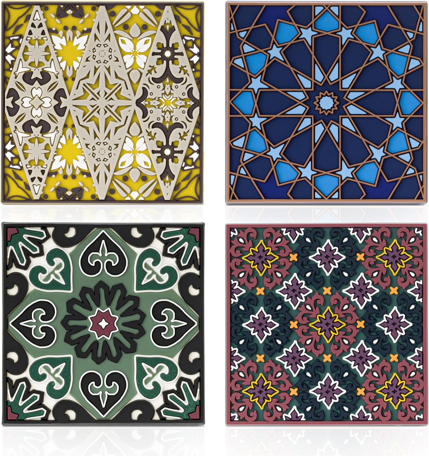 - COLORFUL DESIGNS THAT YOU WON'T SEE SIMILAR ANYWHERE Our designs are based on 3D geometric patterns from ancient history, we applied the designs on 3D colorful coasters that will add a nice touch to your home collection