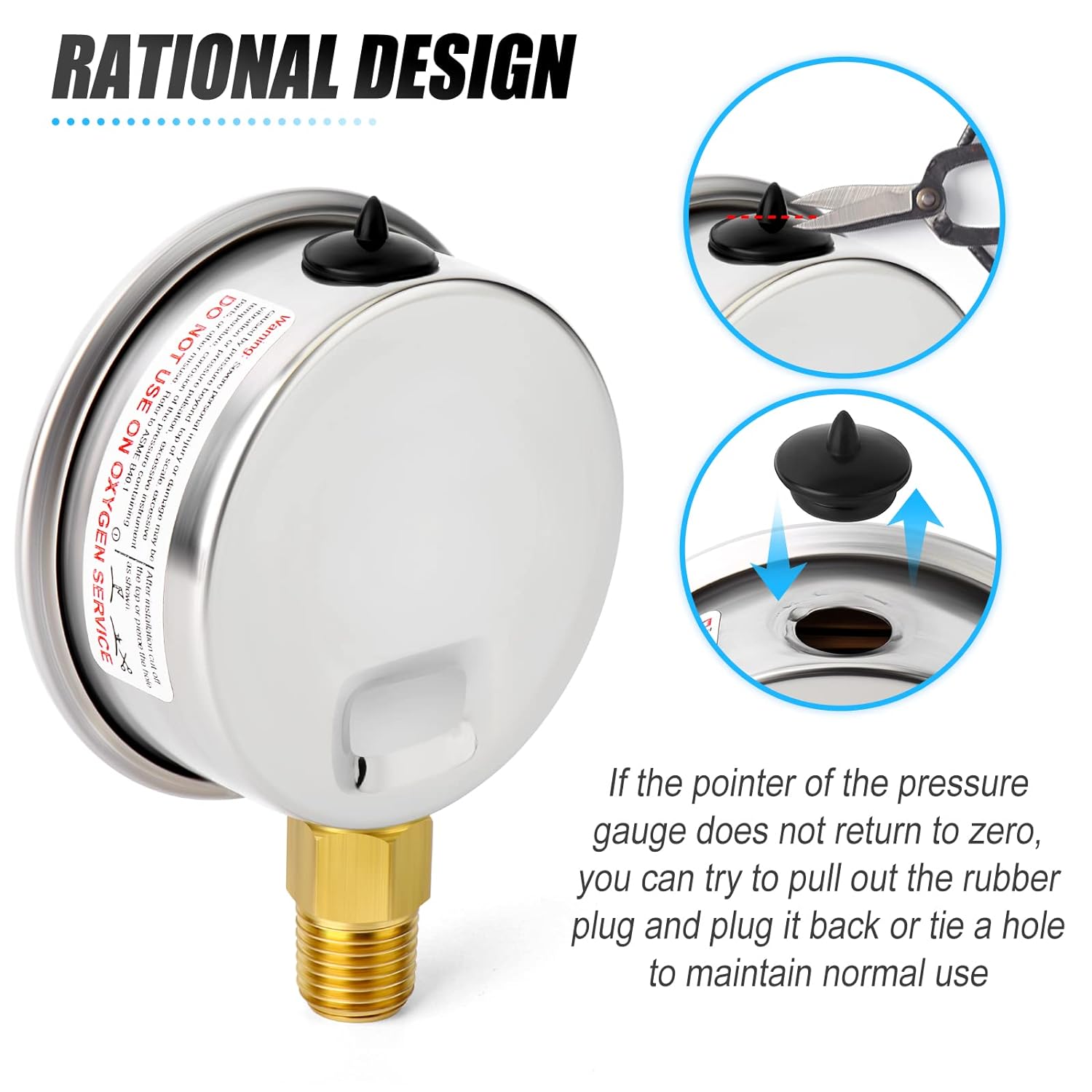 MEANLIN MEASURE 1/4" NPT 0-35psi Pressure Gauge, 2" Dial Glycerine Filled Pool Filter, 304 Stainless Steel Housing, Back Mount, with 1/2" NPT and 3/8" NPT Hex Bushing