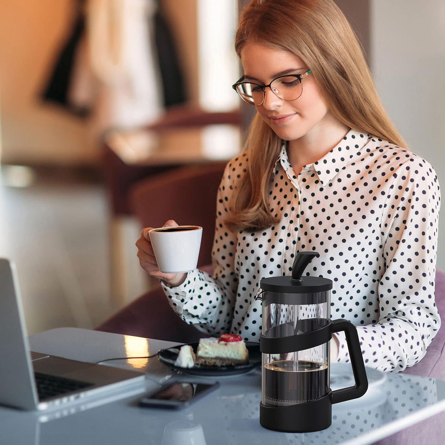 - STYLISH AND DURABLE DESIGN: Small coffee presses carafe made of durable, heat-resistant German borosilicate glass and has good heat insulation effect ; The ergonomic handle is comfortable to grip,the base and handle are made of BPA-free polypropylene and you don't touch hot glass !