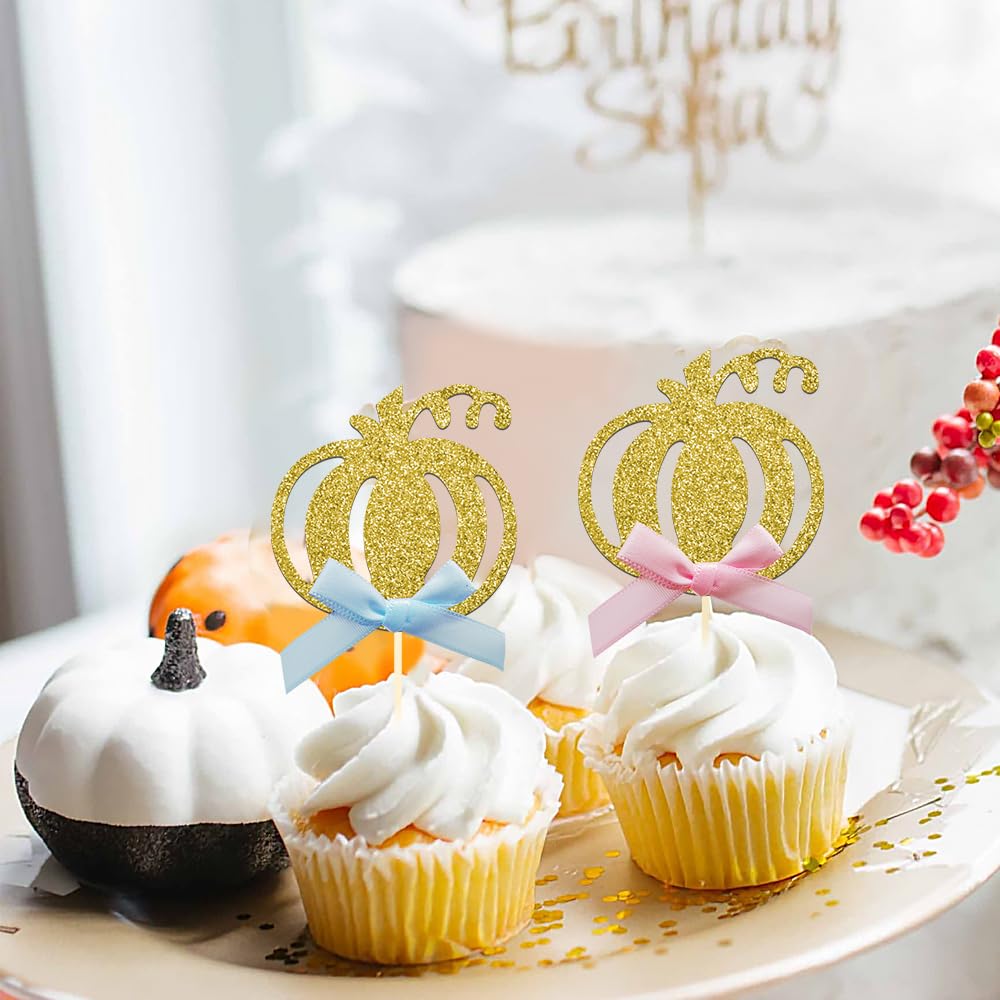 24pcs Pumpkin Gender Reveal Cupcake Toppers - Baby Shower Girl or Boy Party Decorations Supplies, Pumpkin Food Pick (Blue and Pink Bow)