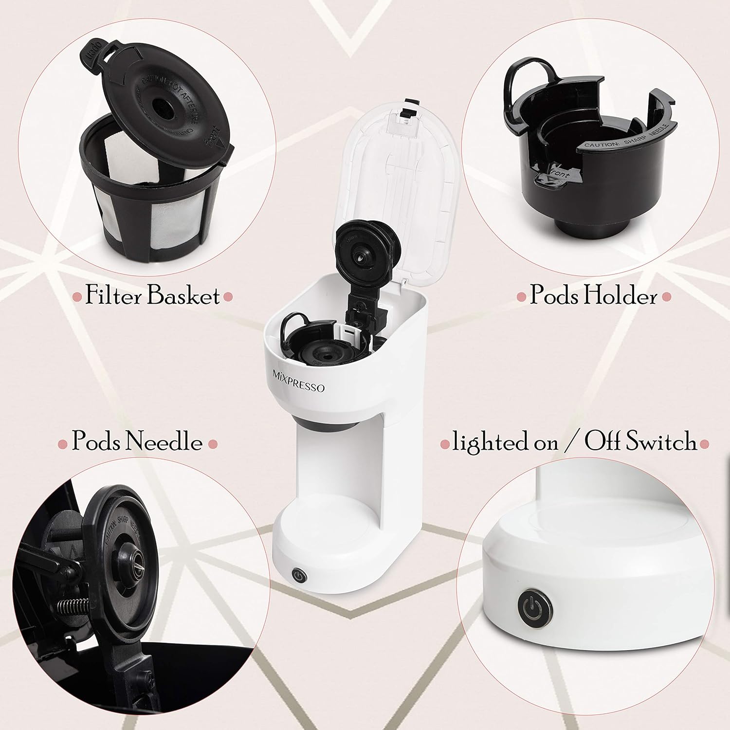Mixpresso 2 in 1 Brewer Single Serve Coffee Maker for K Capsule and Ground Coffee, Single Cup Coffee Machine, Compact Size Mini Coffee Maker Quick Brew Technology 14oz White One Cup Coffee Brewer