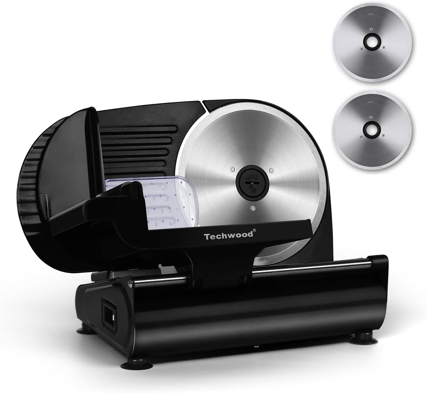 Meat Slicer, Techwood 200W Electric Food Slicer with Removable 9” Stainless Steel Blade, Deli Fruit Vegetable Cutter with Adjustable Knob for Thickness, Food Carriage & Non-Slip Feet, Double Blade