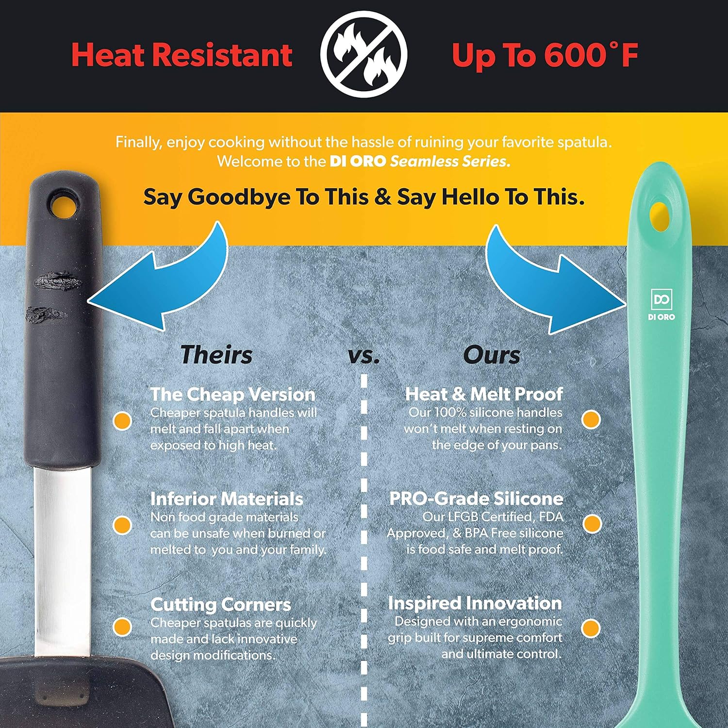 - ONLY THE BEST – The DI ORO Seamless Series Spoonula is made with food grade, BPA Free, and LFGB Certified Silicone. Built to withstand the heat, our versatile and dependable spoonula is heat-resistant up to 600°F, which means you will never melt your favorite kitchen utensil.
