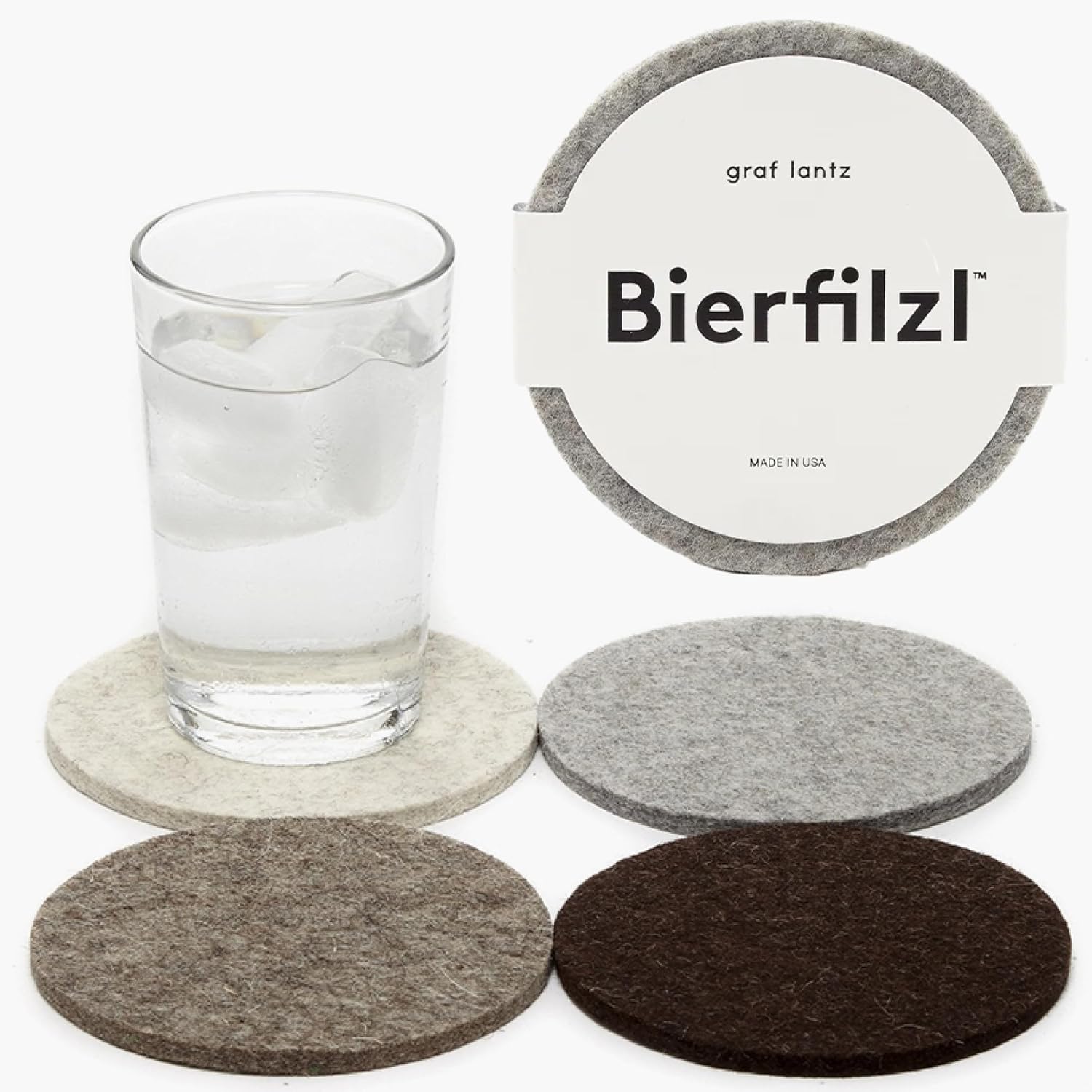 - Bierfilzl Felt Coasters: Our traditional drink coasters are as elegant as they are effective. German-engineered for optimal surface protection. Includes 4 hand-cut, heavy-duty, 5mm coasters in Heather White, Granite, Ash Brown, and Chocolate.
