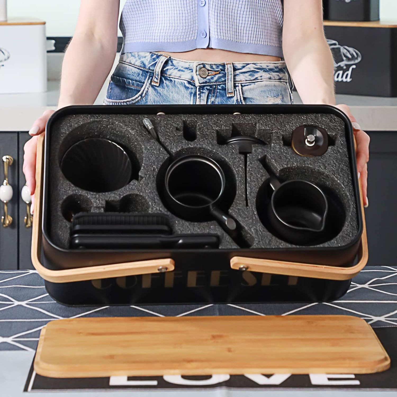 SOTECH Pour Over Coffee Maker Set Coffee Kettle Scale Ceramic Server Ceramic Dripping Cup Bean Grinder Filter Paper Ceramic Cup ALL in 1 Portable Metal Box for Traveling