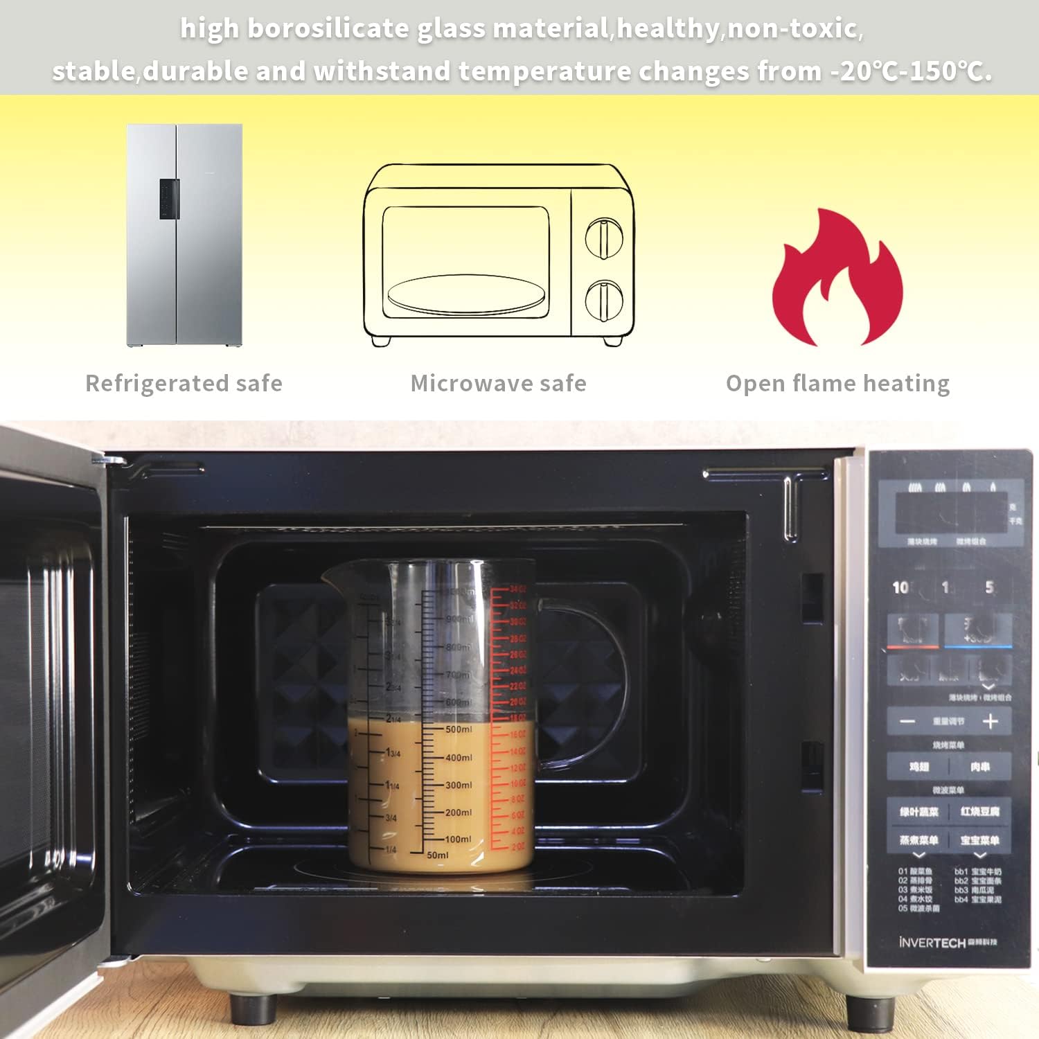 - 1000 ML [4 cups]. Made of high borosilicate glass. Suitable for gas stove, microwave oven, electric ceramic stove, oven and refrigerator, not safe in induction cooker