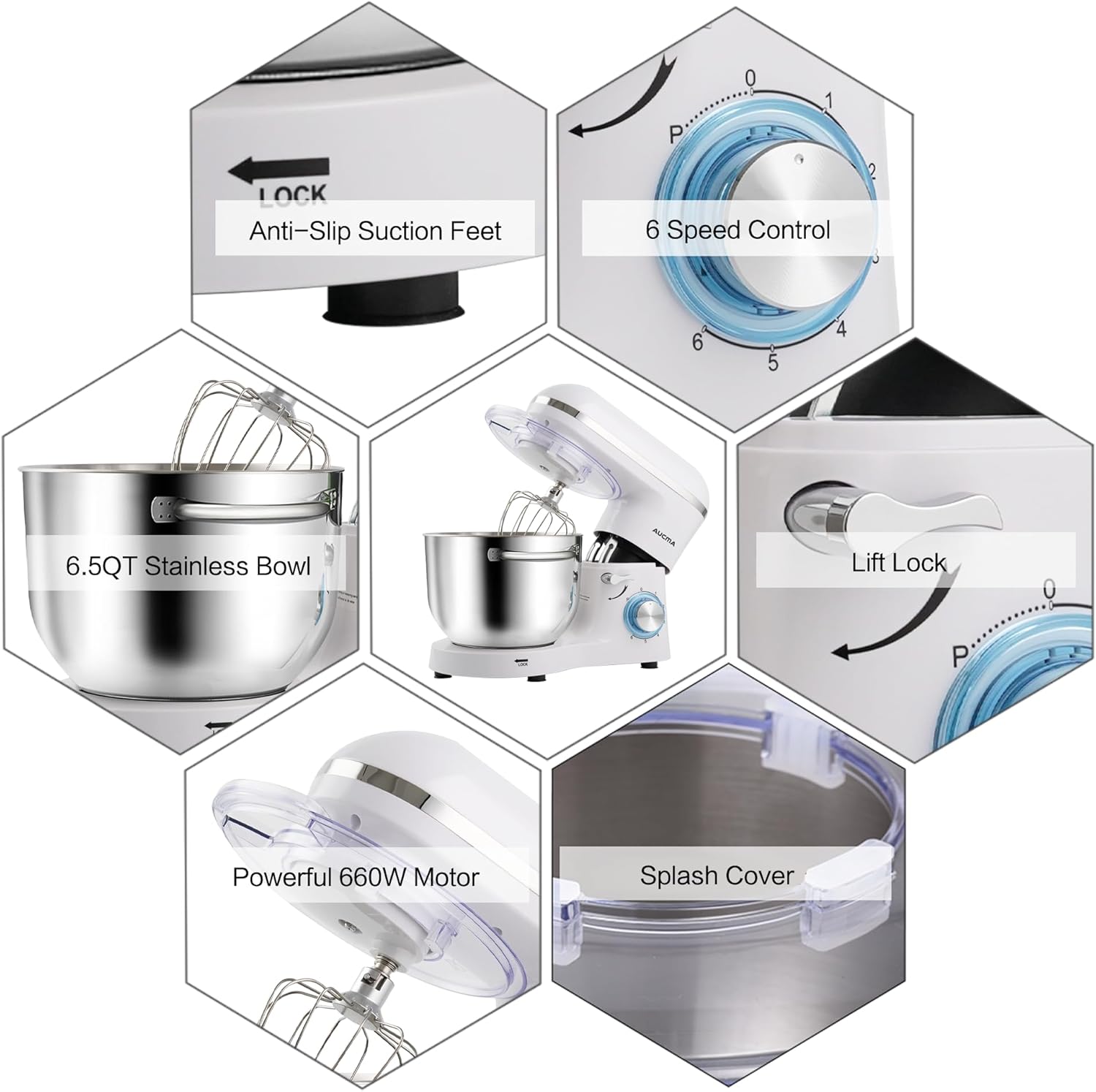- Multiple Attachment Set - Aucma stand mixer comes with three mixing accessories: whisk, dough hook, mixing beater.The splash guard with access hatch helps add ingredients without making a mess.