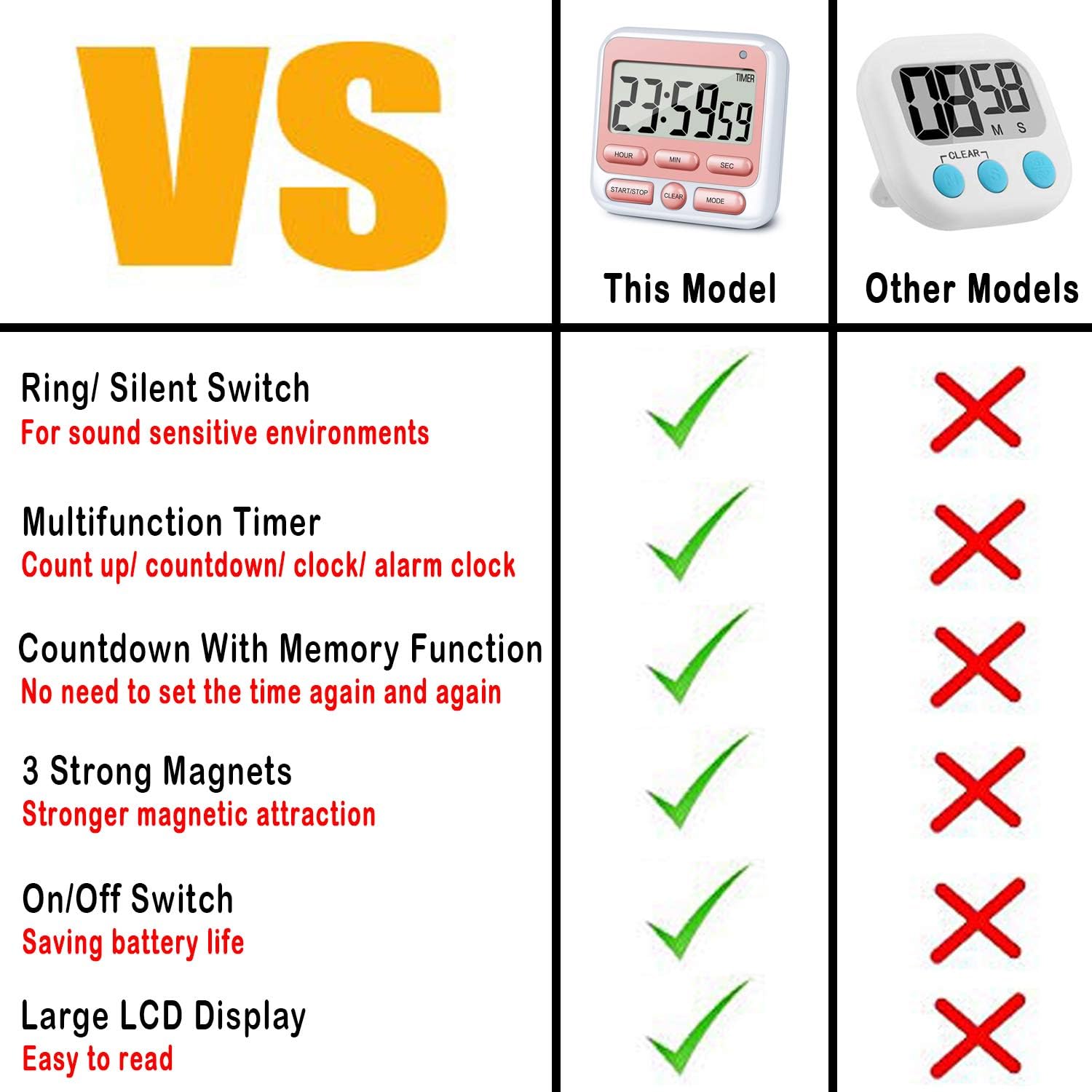 KTKUDY Digital Kitchen Timer with Mute/Loud Alarm Switch ON/Off Switch, 24 Hour Clock & Alarm, Memory Function Count Up & Count Down for Kids Teachers Cooking, Large LCD Display, Strong Magnet (Pink)