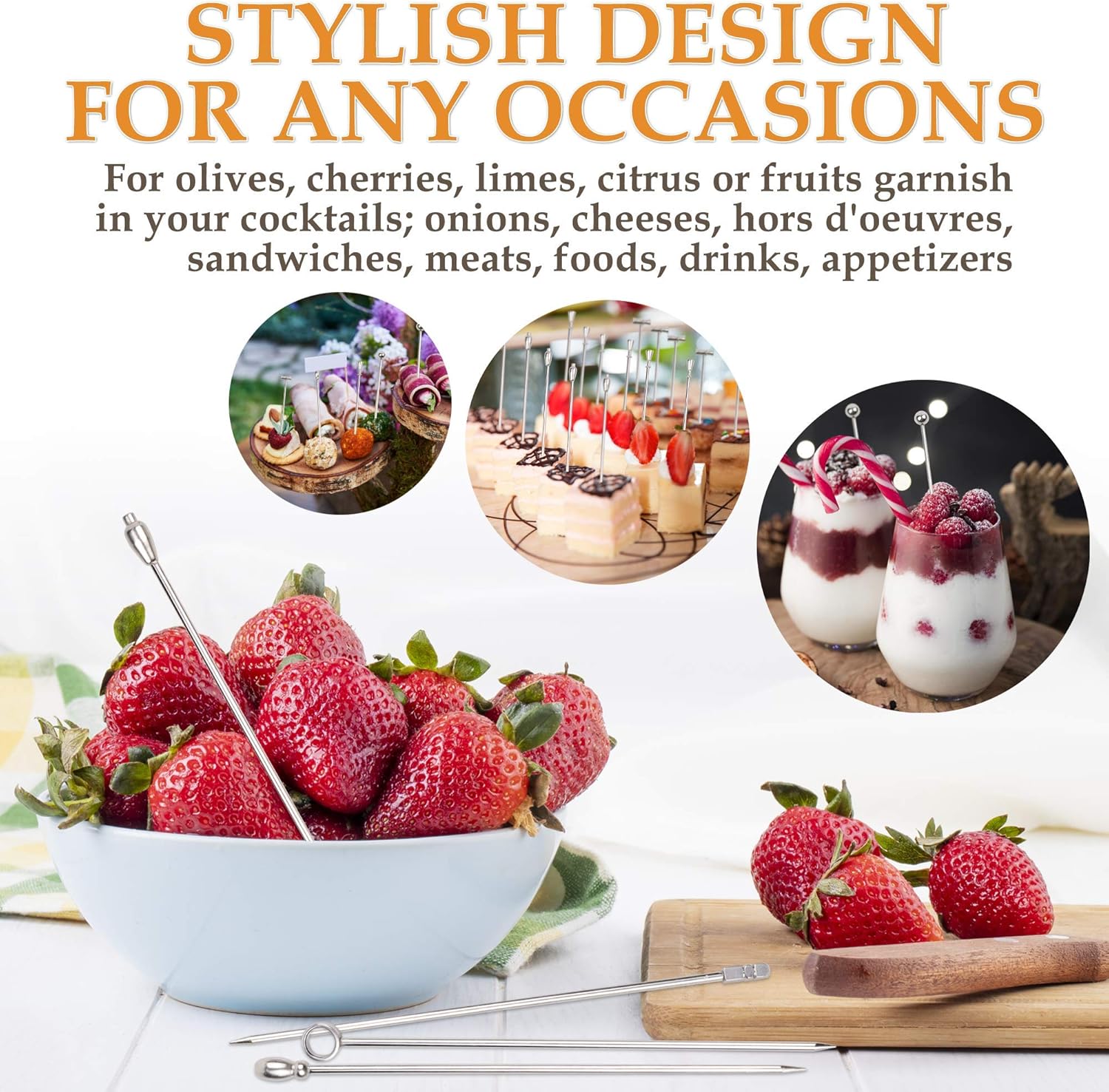 - Wide Applications: These sticks are practical, for olives, cherries, limes, citrus or fruits garnish in your cocktails; onions, cheeses, hors d'oeuvres, sandwiches, meats, foods, drinks, appetizers, blueberry, fondue, bloody mary skewers.
