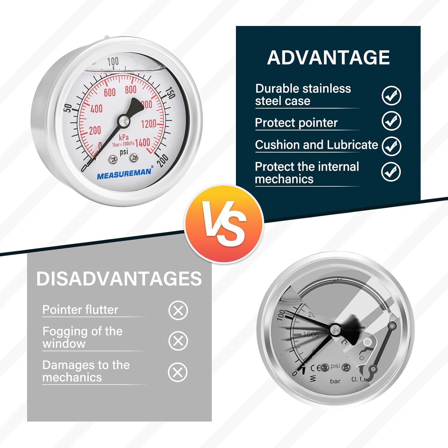MEASUREMAN 2-1/2inch Dial Size, Glycerin Filled Pressure Gauge, 0-200psi/kpa, 304 Stainless Steel Case, 1/4inchNPT Center Back Mount