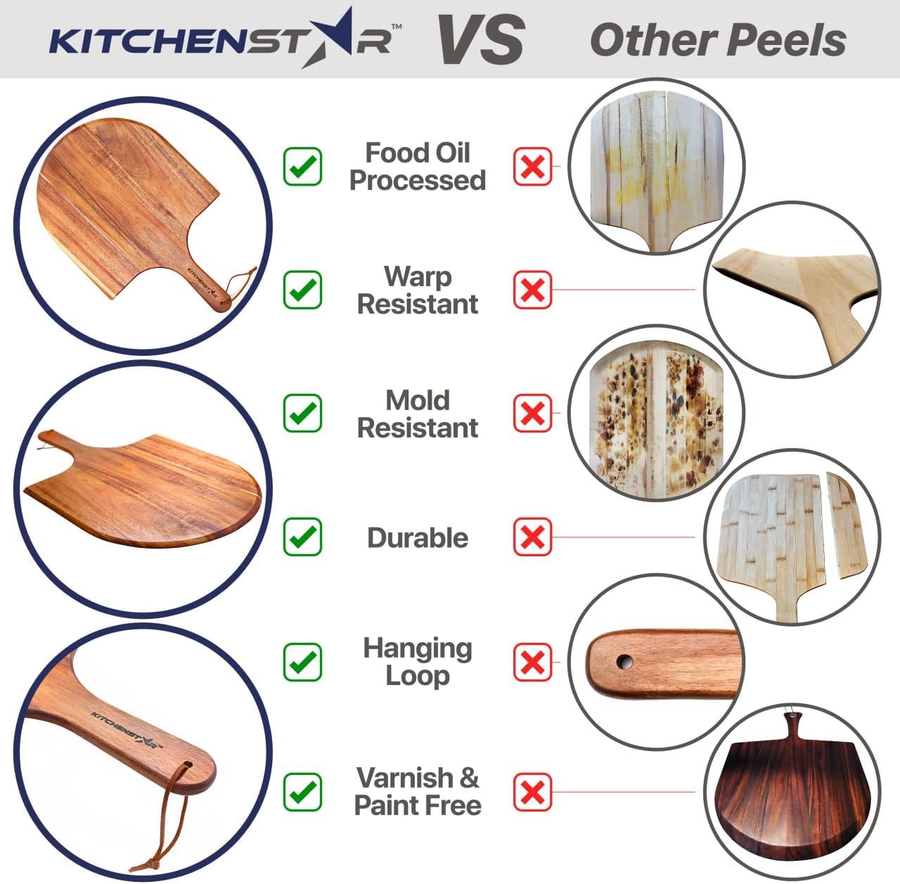 - Premium Acacia Wood: Crafted from durable acacia wood, known for its natural resistance to moisture and cracking. Its beautiful grain adds elegance to your kitchen while ensuring long-lasting use for pizza peels and paddles
