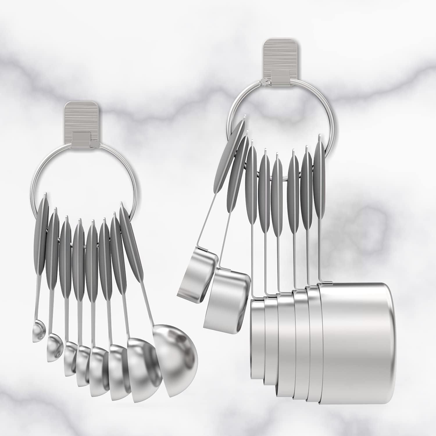 - EASY TO USE: The silicone handle is easy to grasp, non-slip even if use with sweating hands. Heat resistant, protect hands when doing high temperature cooking. The unique stainless steel ring holds the cups/spoons together in the drawer or hangs on the wall and quickly opens when you want to use them separately