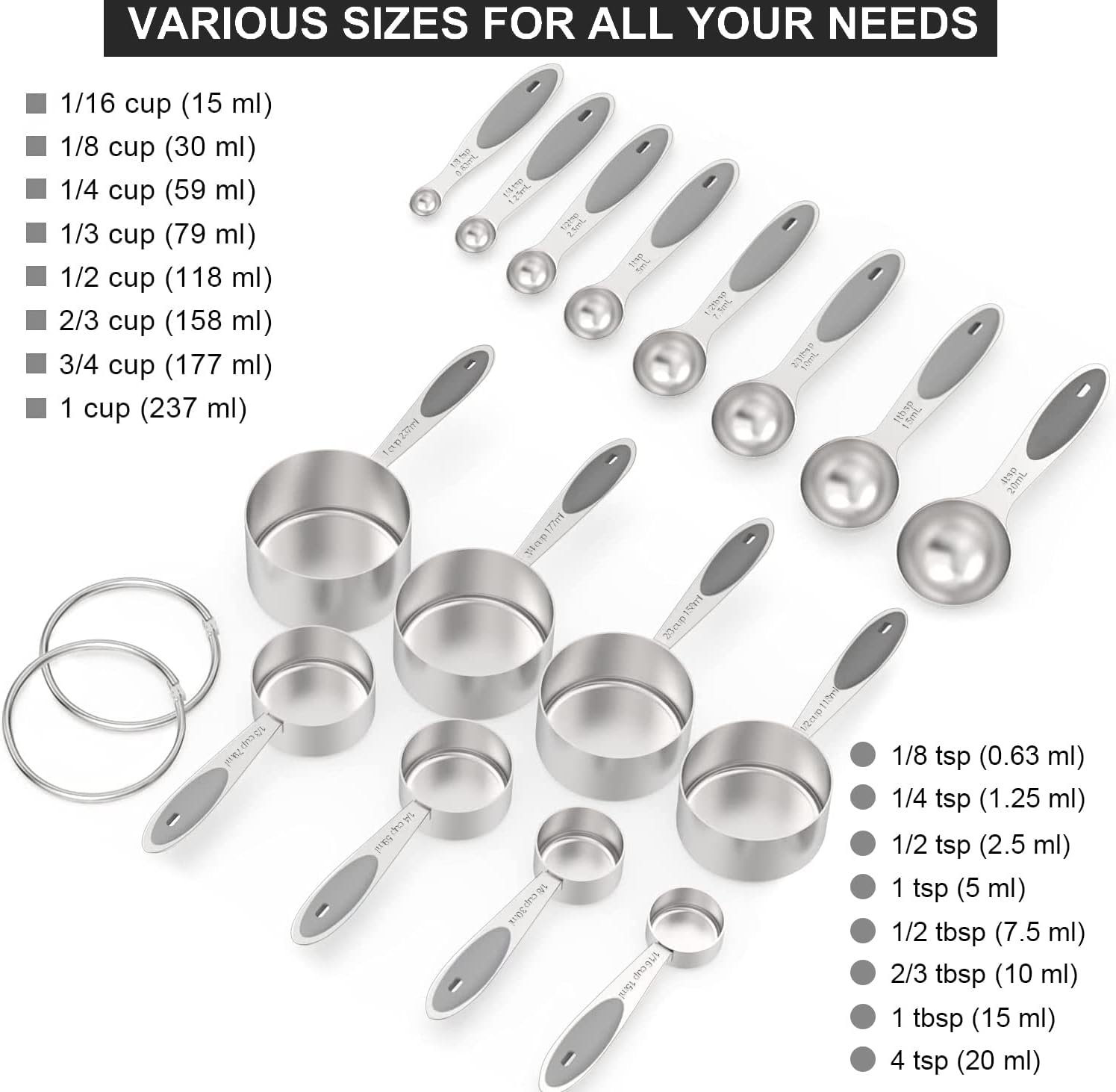 - SET OF 16: Including 8 Measuring cups (1/16 cup, 1/8 cup, 1/4 cup, 1/3 cup, 1/2 cup, 2/3 cup, 3/4 cup, 1 cup), 8 Measuring spoons (1/8 tsp, 1/4 tsp, 1/2 tsp, 1 tsp, 1/2 tsp, 2/3 tbsp, 1 tbsp, 4 tbsp). Meet all your needs on cooking and baking