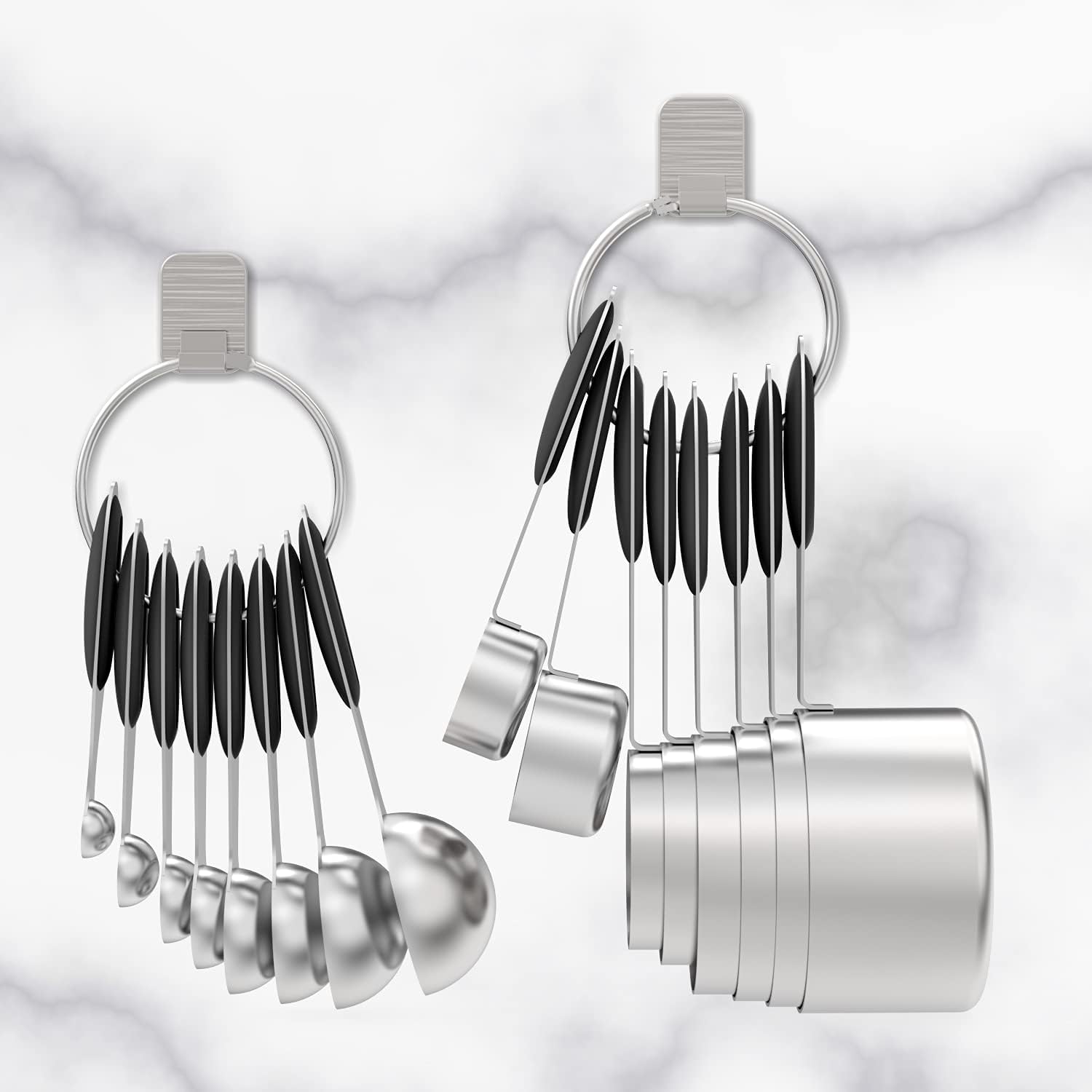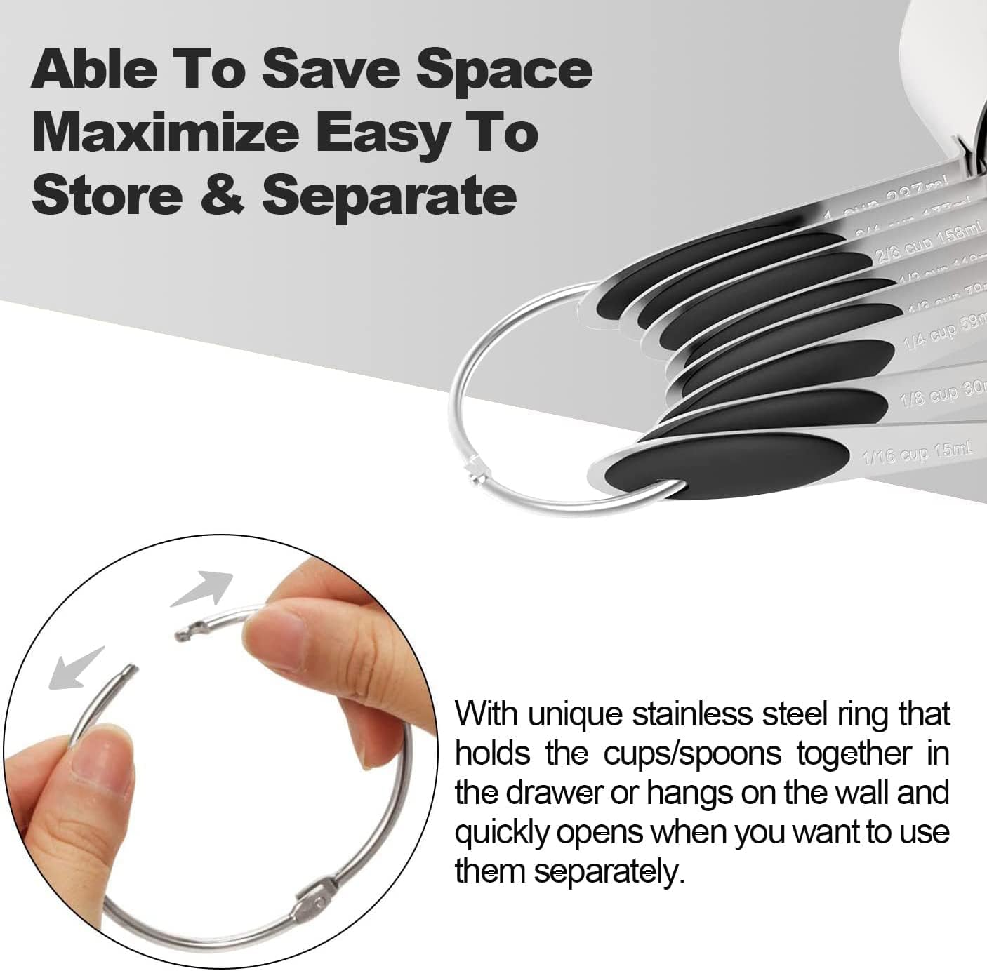 - EASY TO USE: The silicone handle is easy to grasp, non-slip even if use with sweating hands. Heat resistant, protect hands when doing high temperature cooking. The unique stainless steel ring holds the cups/spoons together in the drawer or hangs on the wall and quickly opens when you want to use them separately