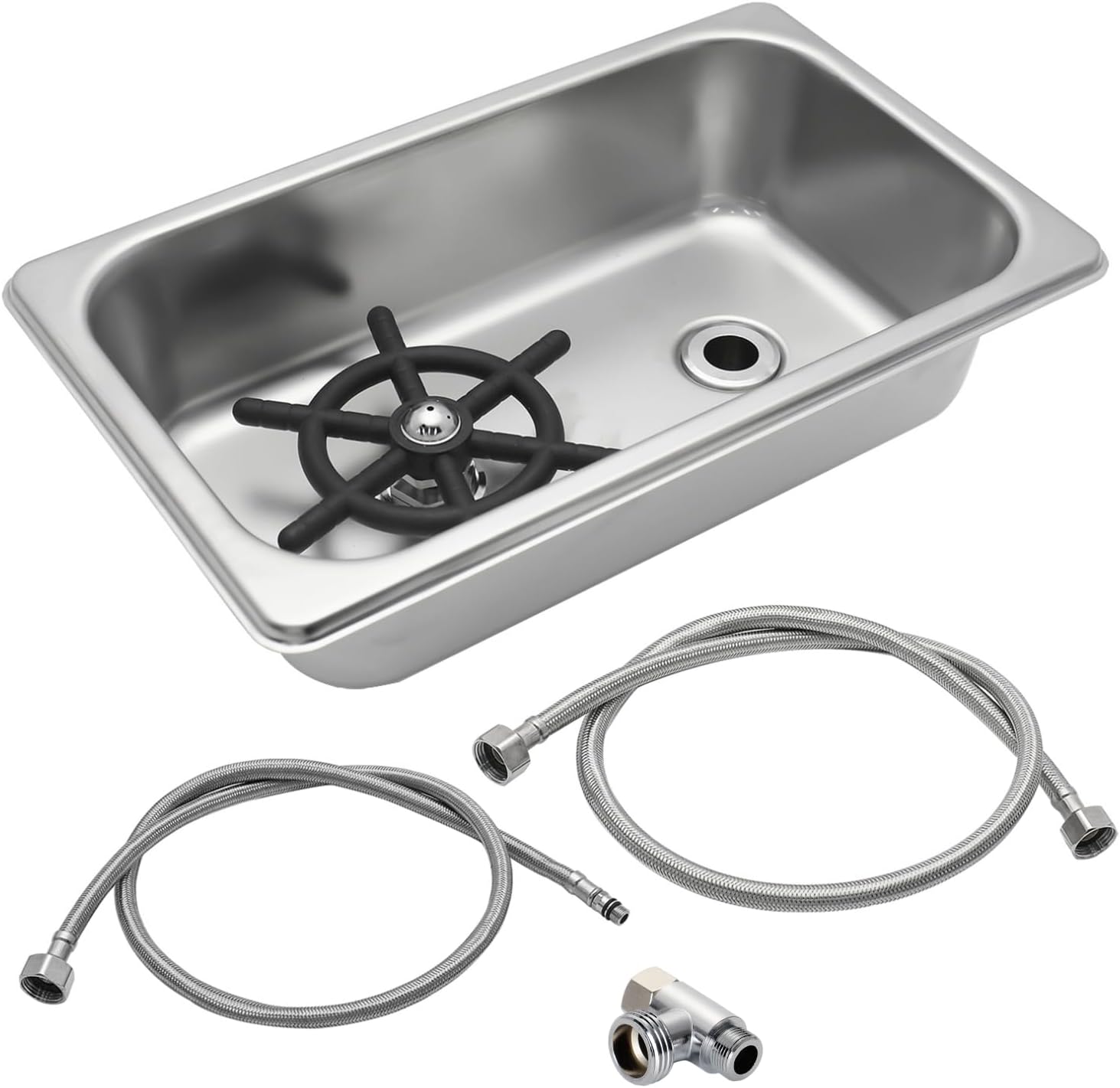 - Convenience And Practical: The water inlet and outlet are set to ensure that the dirty water is quickly drained out and keep the sink clean,The finely crafted stainless steel drip tray provides enough place for the cleaned cups to dry , not easy to rust and not easy to corrode.Equipped with two pieces braided hose inlet pipe
