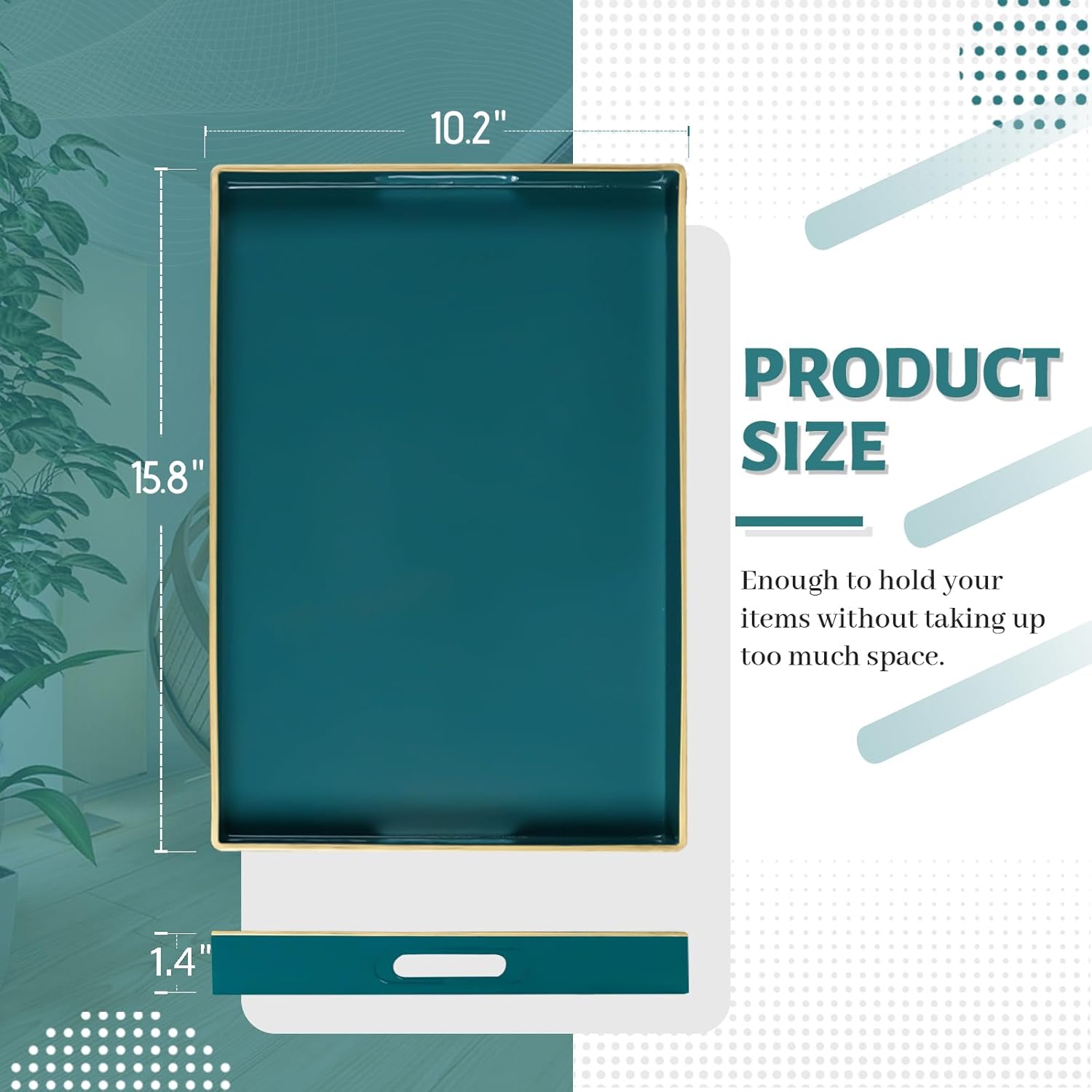 MAONAME Teal Serving Tray with Handles, Modern Decorative Tray for Coffee Table, Plastic Rectangular Trays for Ottoman, Bathroom, Decor, 15.8” x 10.2” x1.4