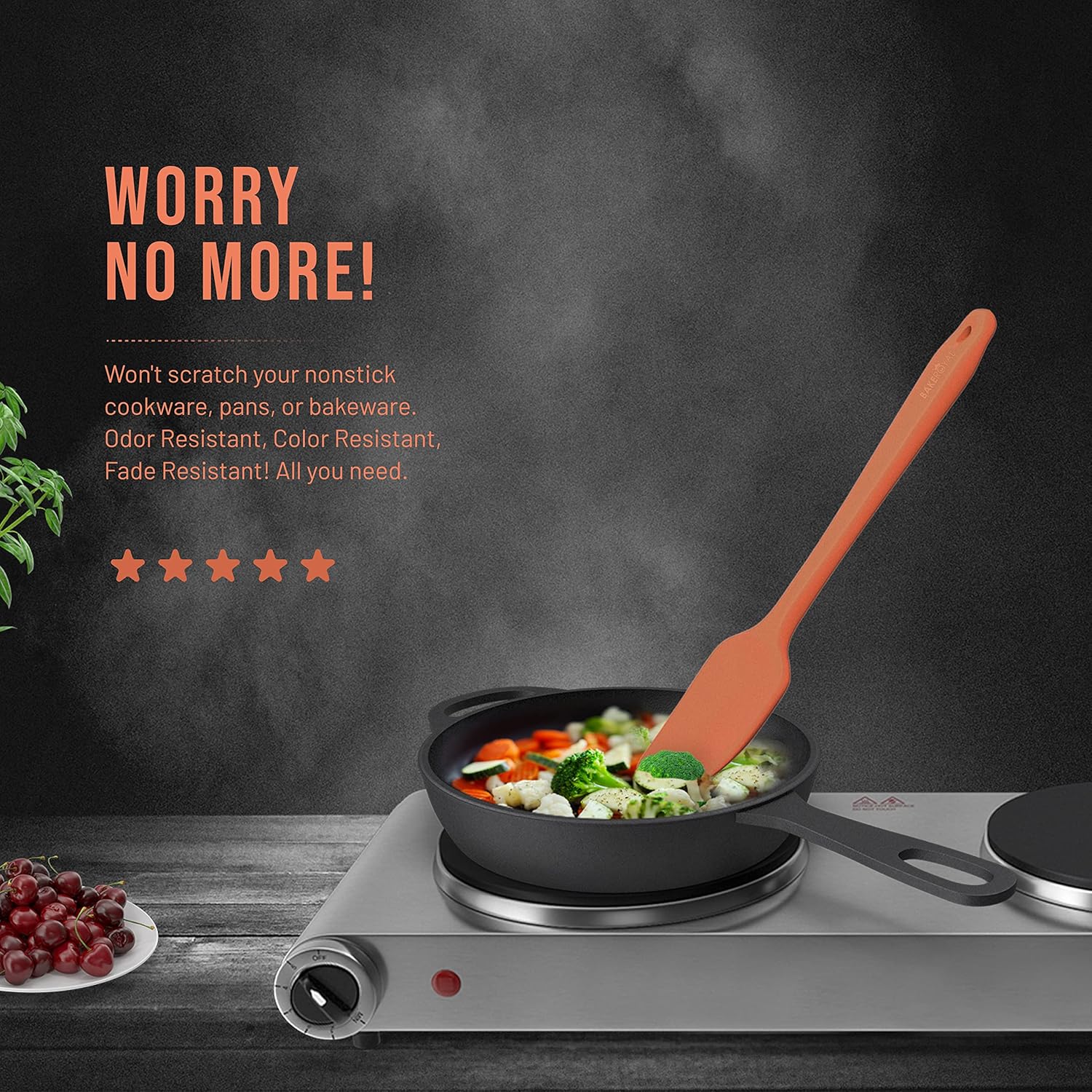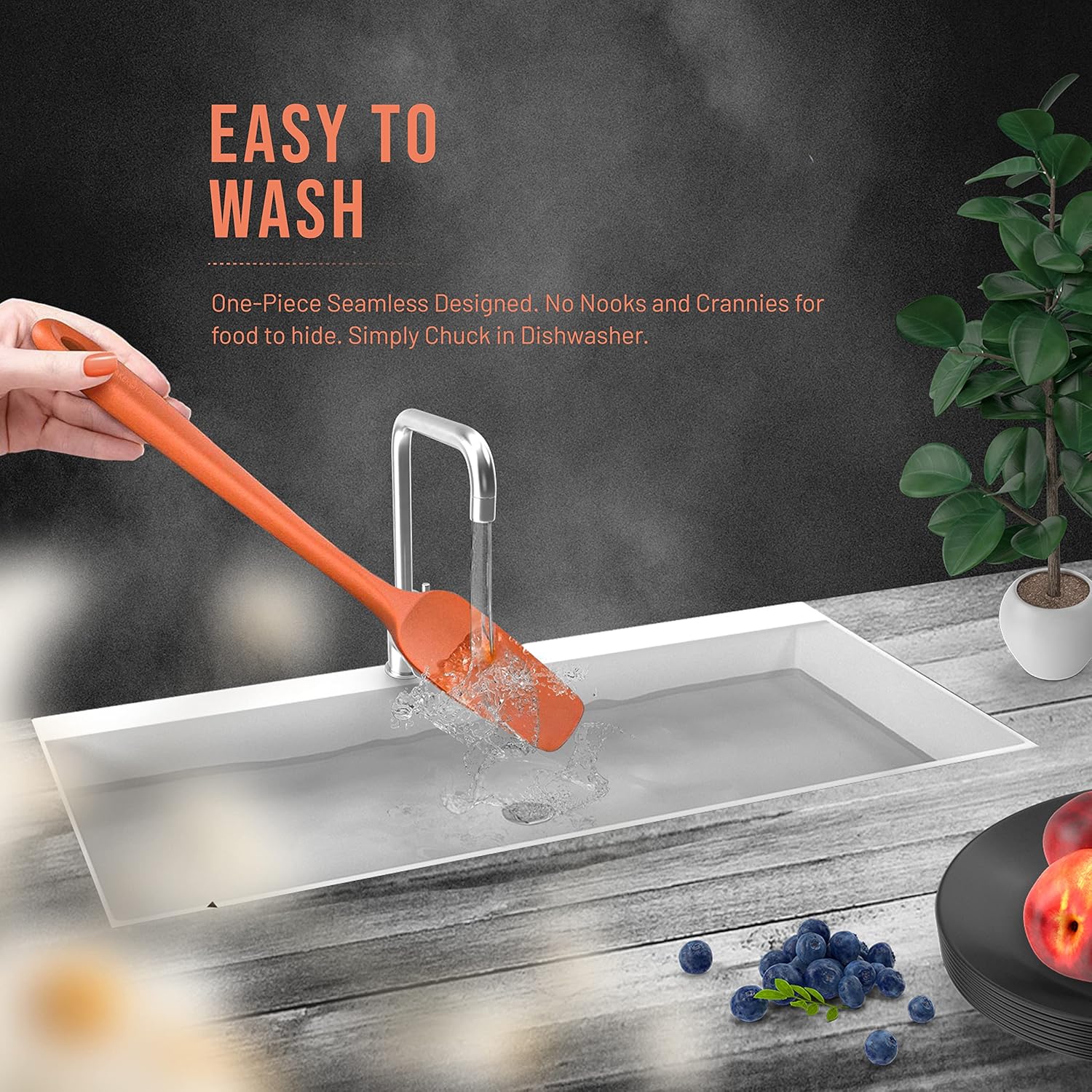 - Best Bang For Your Bucks At A Glance: 600°F Heat Resistant Spatulas for Cooking | High Grade Silicone Rubber | Easy Clean in Dishwasher | Stain and Odor Resistant | 4-Piece including Large Spatula, Mini Spatula, Spoonula Spatula, Jar Spatula | Super Strong Handle for Heavy Task with Comfortable Grip | Soft Head Tip For Non-Stick Cookware | 5 Colors; Black, Blue, Red, Aqua, Orange | Catchy Packaging for Gift