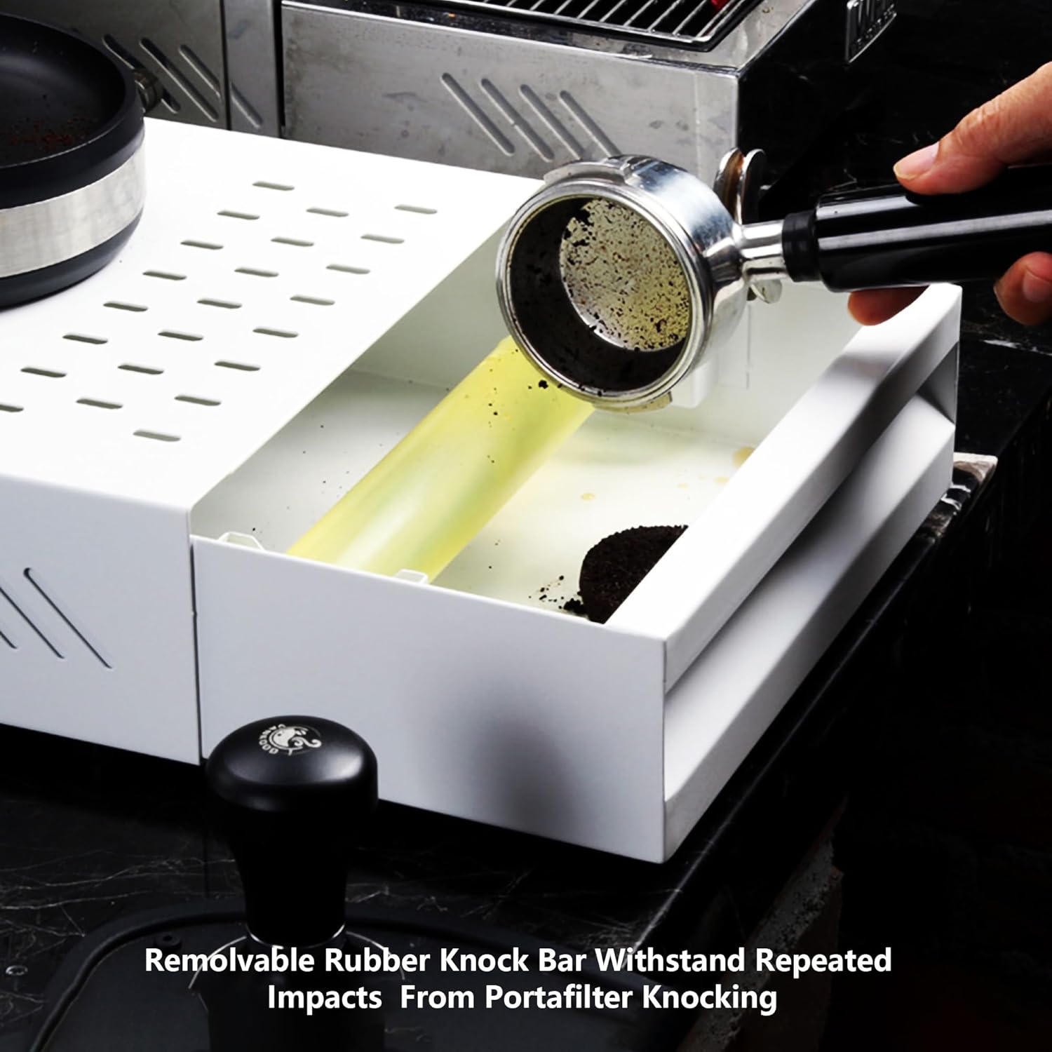 - EASY MAINTENANCE: Removable knock bar with rubber cushioning reduces noise and makes cleaning quick and simple. Removable drawer design makes disposing of used coffee grounds and cleaning the container quick and simple