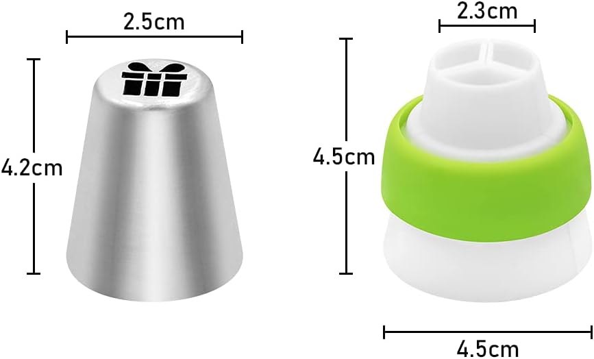 - Piping Tips Set Include:13 x Christmas decorating mouth set, 1x Pastry Bags, 1x Standard Couplers.The lower mouth of the flower mouth is about 3.7 cm in diameter, the upper mouth is 2.5 cm in diameter, and the height is about 4.2 cm.