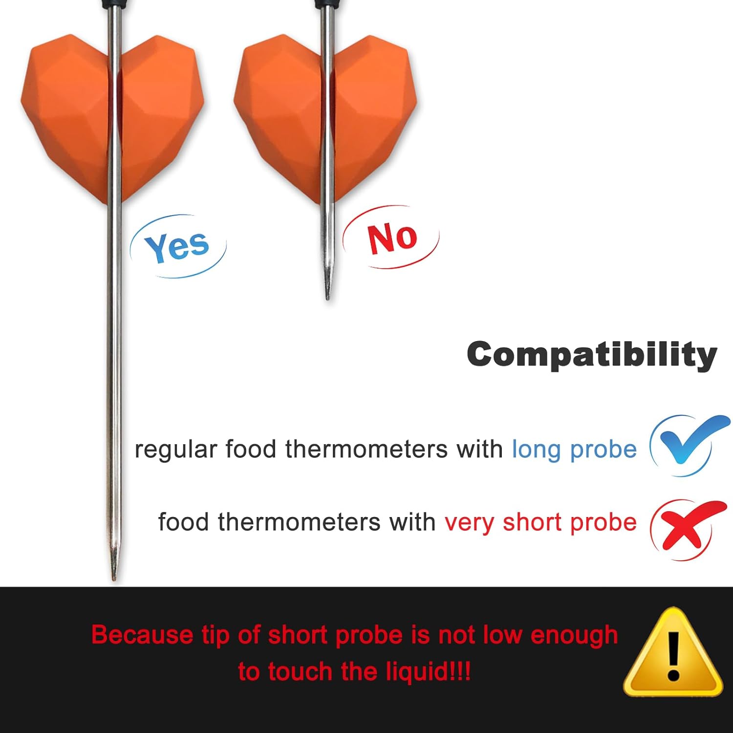 - Compatibility: Works for most regular food meat candy probe thermometers except for those with very short probes which are not low enough to touch liquid