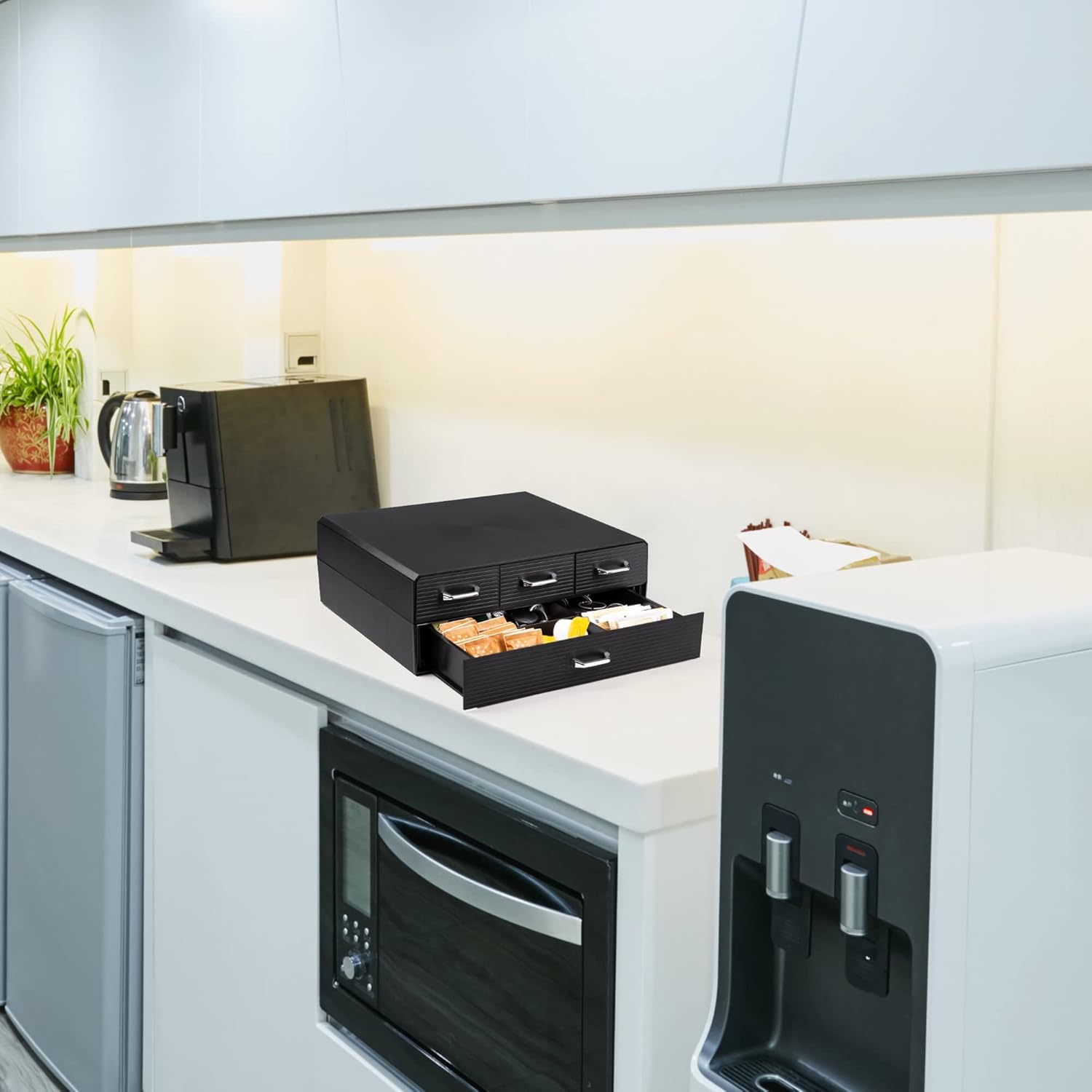 - Sleek Design: Mirror-finish handles; simple black appearance; smooth drawer-pulling even with a coffee machine on it.This black coffee pod organizer is a nice choice for your modern kitchen.