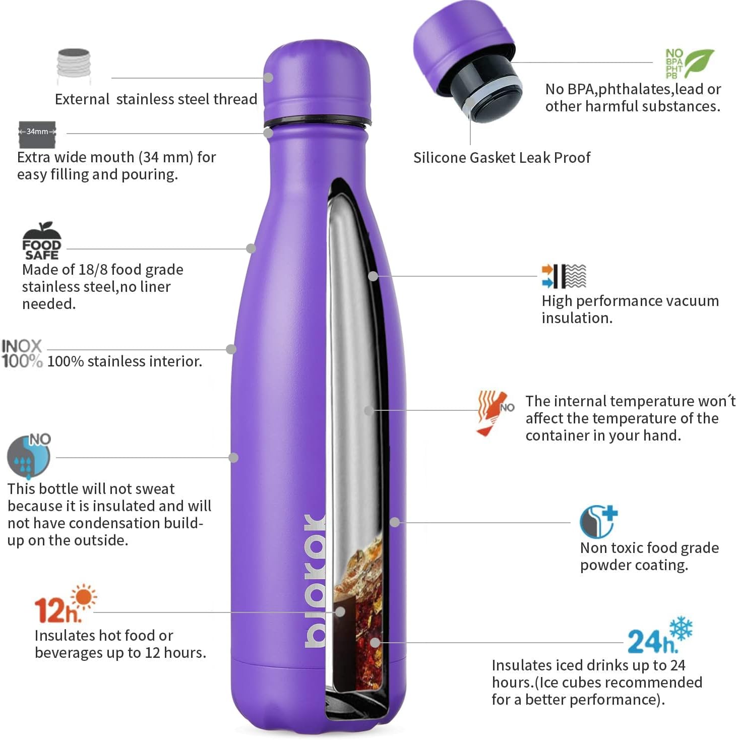 BJPKPK 17oz Insulated Stainless Steel Water Bottles,Sports Water Bottles Keep Cold for 24 Hours and Hot for 12 Hours,BPA Free for Travel,Purple cap