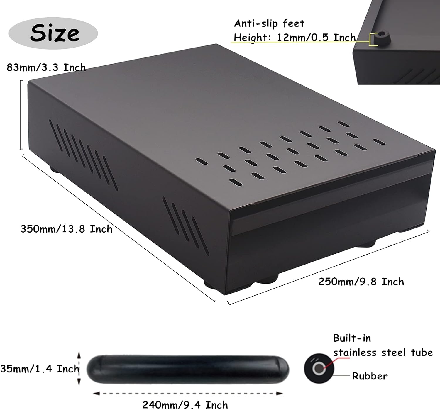 - Strong Load-bearing Capacity: Length: 350mm(13.8inch), width: 250mm(9.8inch), Heigth: 83mm(3.3 inches), The outer shell is made of 0.06 Inch thick stainless steel sheet, which has excellent load-bearing capacity. It can be placed under grinders, small household coffee machines, and most of type coffee machines, please according to the size of the coffee machine you need to match
