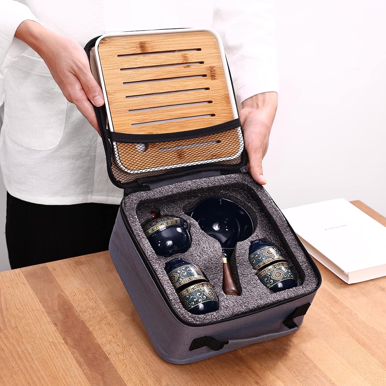 LURRIER Porcelain Chinese Gongfu Tea Set,Portable Teapot Set with 360 Rotation Tea maker and Infuser,Portable All in One Gift Bag for Travel,Home,Gifting,Outdoor and Office (Floral Blue)