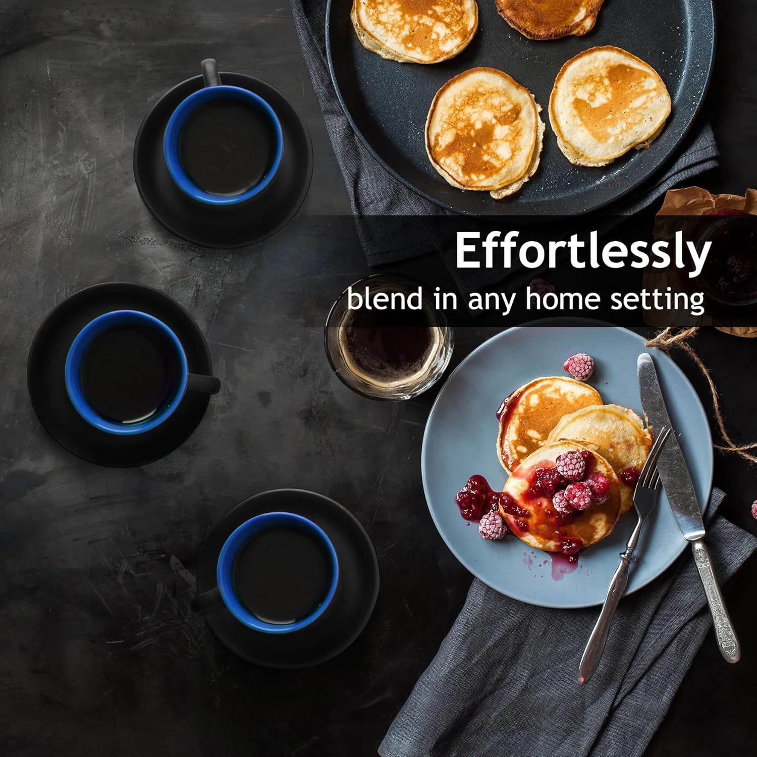 MIAMIO - 2.5 oz Espresso Cup Set with Saucers Coffee Mug Set of 6 - Ceramic Coffee Mug Stackable Espresso Mug with Stand for Coffee Drinks, Latte, Cafe Mocha - Le Papillon Collection (Blue)