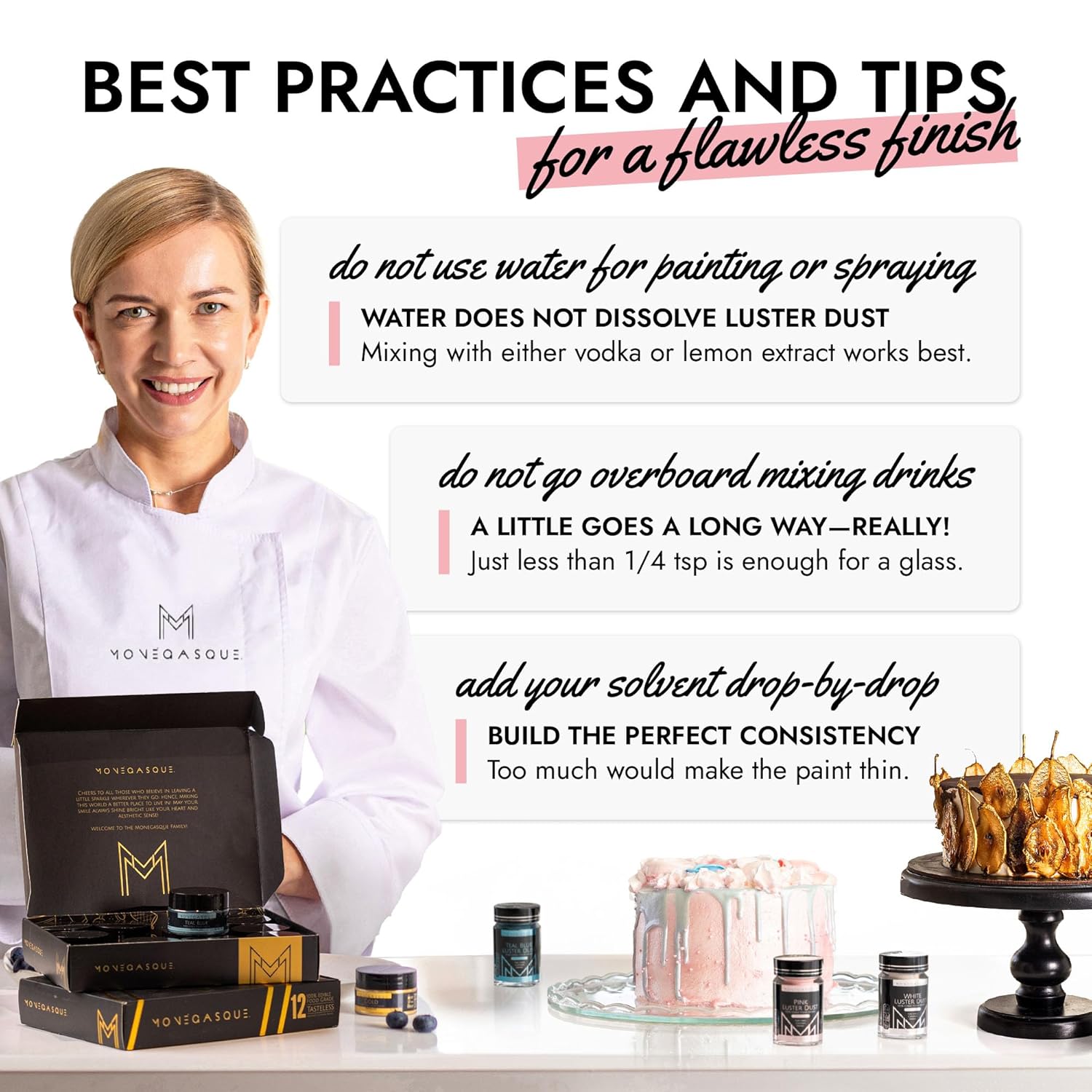 - EASY TO USE: Our pink luster dust is incredibly versatile. Apply with a wet brush, airbrush, or dry brush, and even mix into beverages. Achieve professional-looking results effortlessly at home, whether decorating cakes or adding shimmer to cocktails.