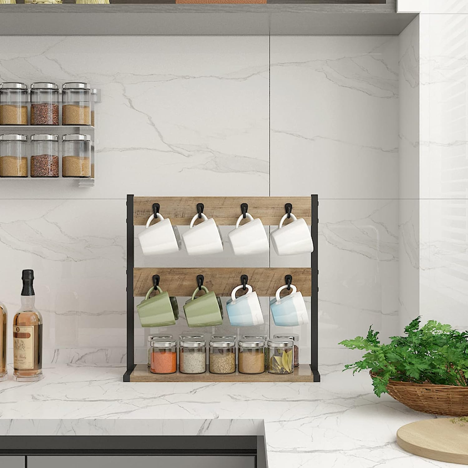 - RUSTIC MINIMALIST DECOR: The countertop coffee mug holder stand with simple and elegant industrial design create a farmhouse vibe to your kitchen, sitting room, coffee bar, tea room. Flexible desktop placement as you wish, which is perfect fit for kitchen countertops or dining table space and adds more convenience and style to your home life.