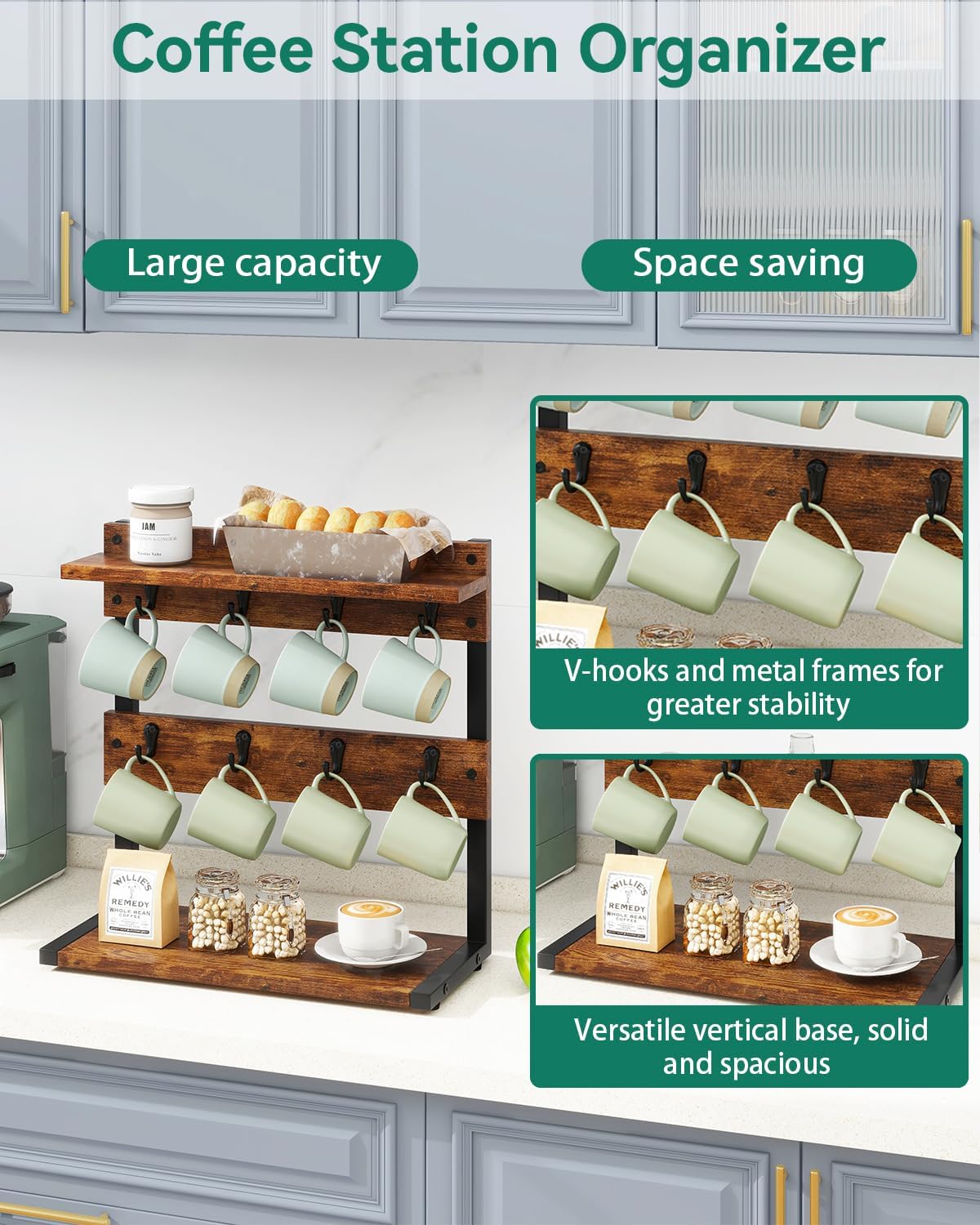 IBUYKE Rustic Coffee Mug Holder Stand, 2 Tier Countertop Mug Tree Holder Rack with Storage Base, Vintage Mug Holders for Kitchen, Holds 8 Mugs, Rustic Brown UTBJ002H
