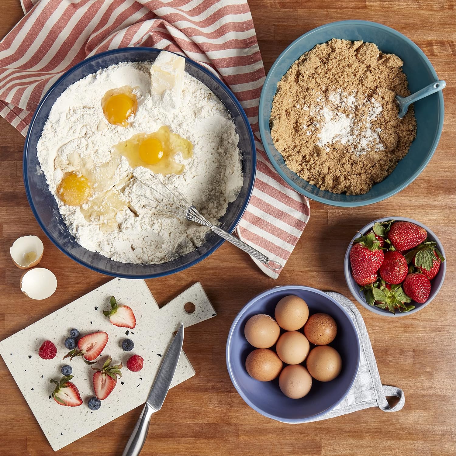- VINTAGE STYLE: Our embossed Hobnail mixing bowls bring a vintage style to your kitchen, with a simple textured pattern that gives each bowl a casually elegant look and a comfortable grip for mixing together ingredients. The charming palette of pastel blues adds a lovely touch of color to your kitchen design. Vintage style meets modern convenience, as these practical mixing bowls nest for space efficient storage in the kitchen.