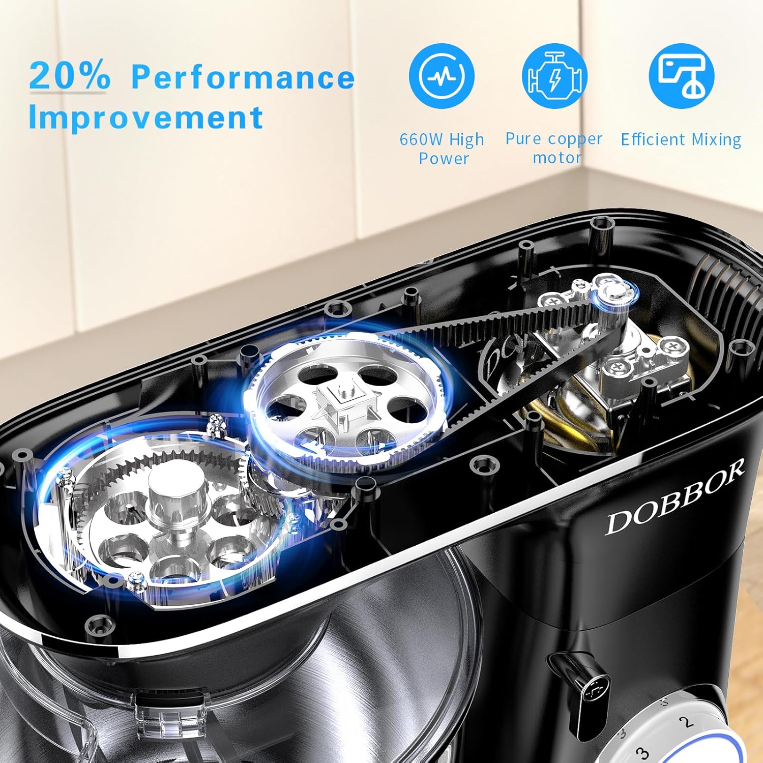 DOBBOR Electric Stand mixer, 9.5QT 660W 6 Speeds Tilt-Head Dough Mixers, Bread Mixer with Dough Hook, Whisk, Beater, Splash Guard for Baking Bread, Cake, Cookie, Pizza, Muffin, Salad and More - Black