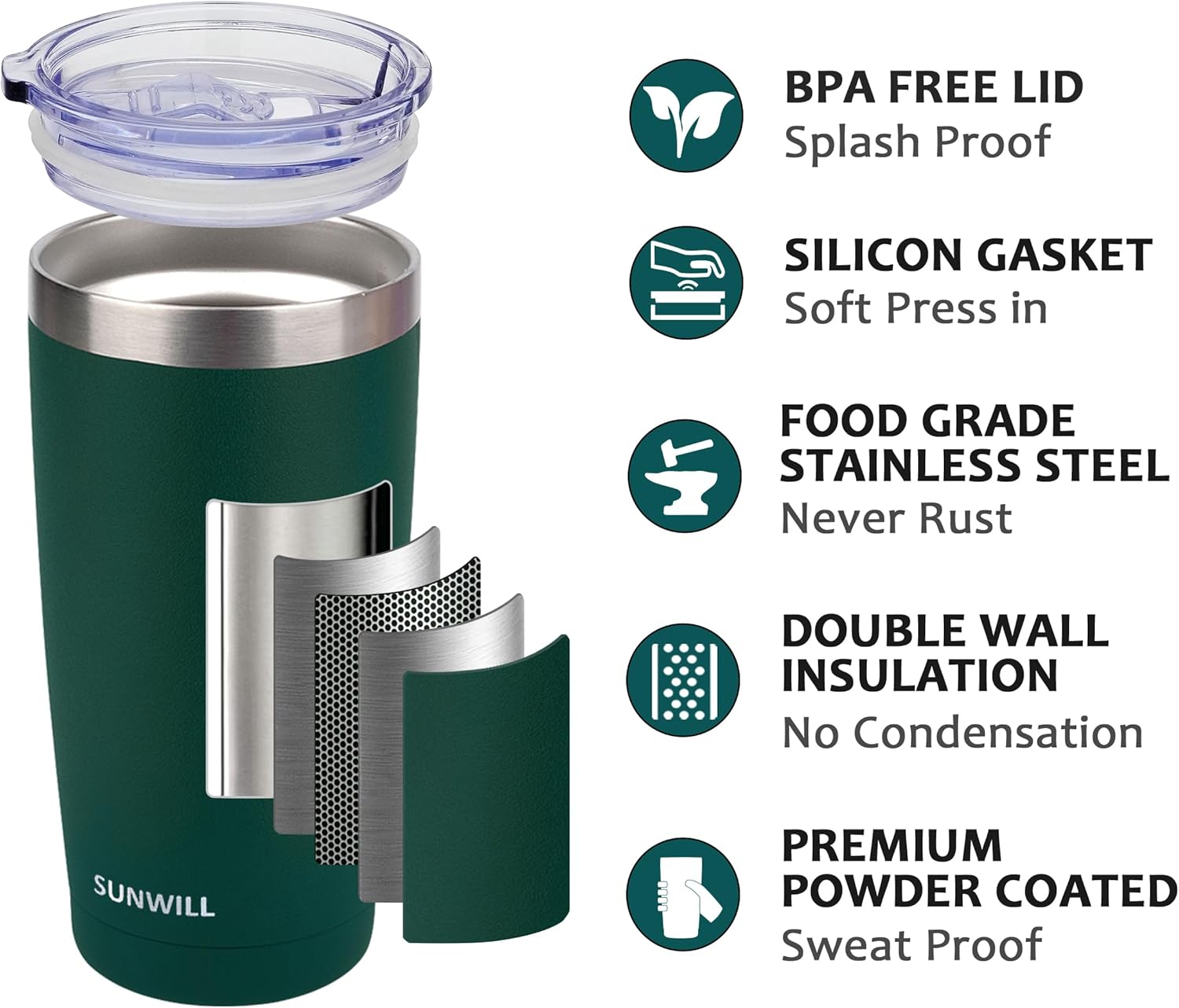 - Insulated 20 oz Coffee tumbler: Double-wall vacuum insulation technology, keep drinks hot for over 6 hours and cold for around 24 hours, sweat proof, no condensation