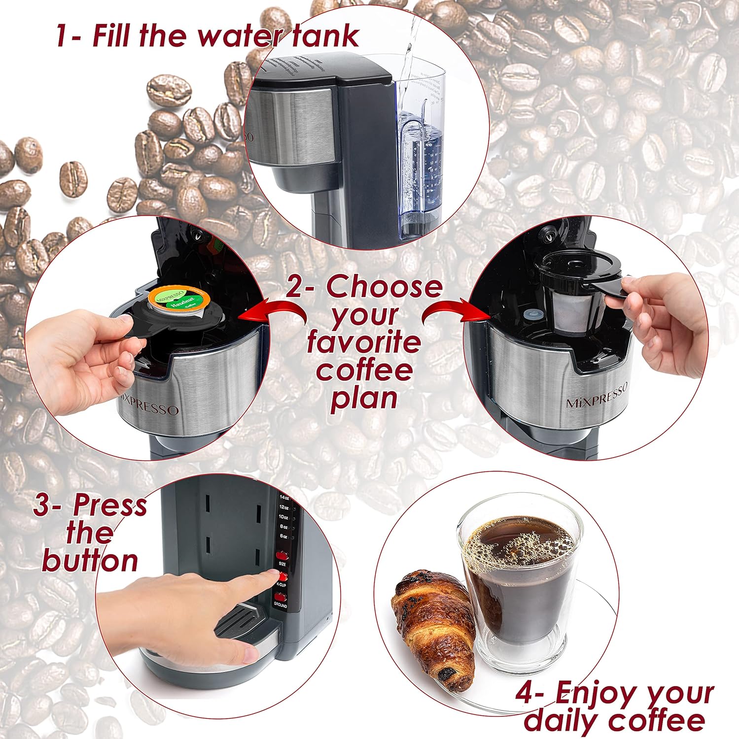 Mixpresso Gray Single Serve Coffee Brewer K-Cup Pods Compatible & Ground, 30 oz Compact Coffee Maker Single Serve With 5 Brew Sizes Up To 14 Oz, Fits Travel Mug, Adjustable Drip Tray