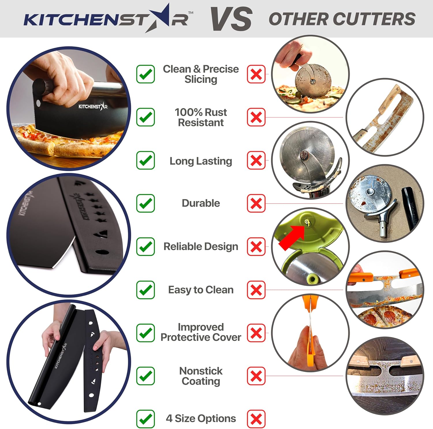 KitchenStar 12-Inch Pizza Cutter Rocker Blade - Sharp Stainless Steel Slicer Knife, Protective Cover, Black Nonstick, Small - Professional Pizza Oven Accessories