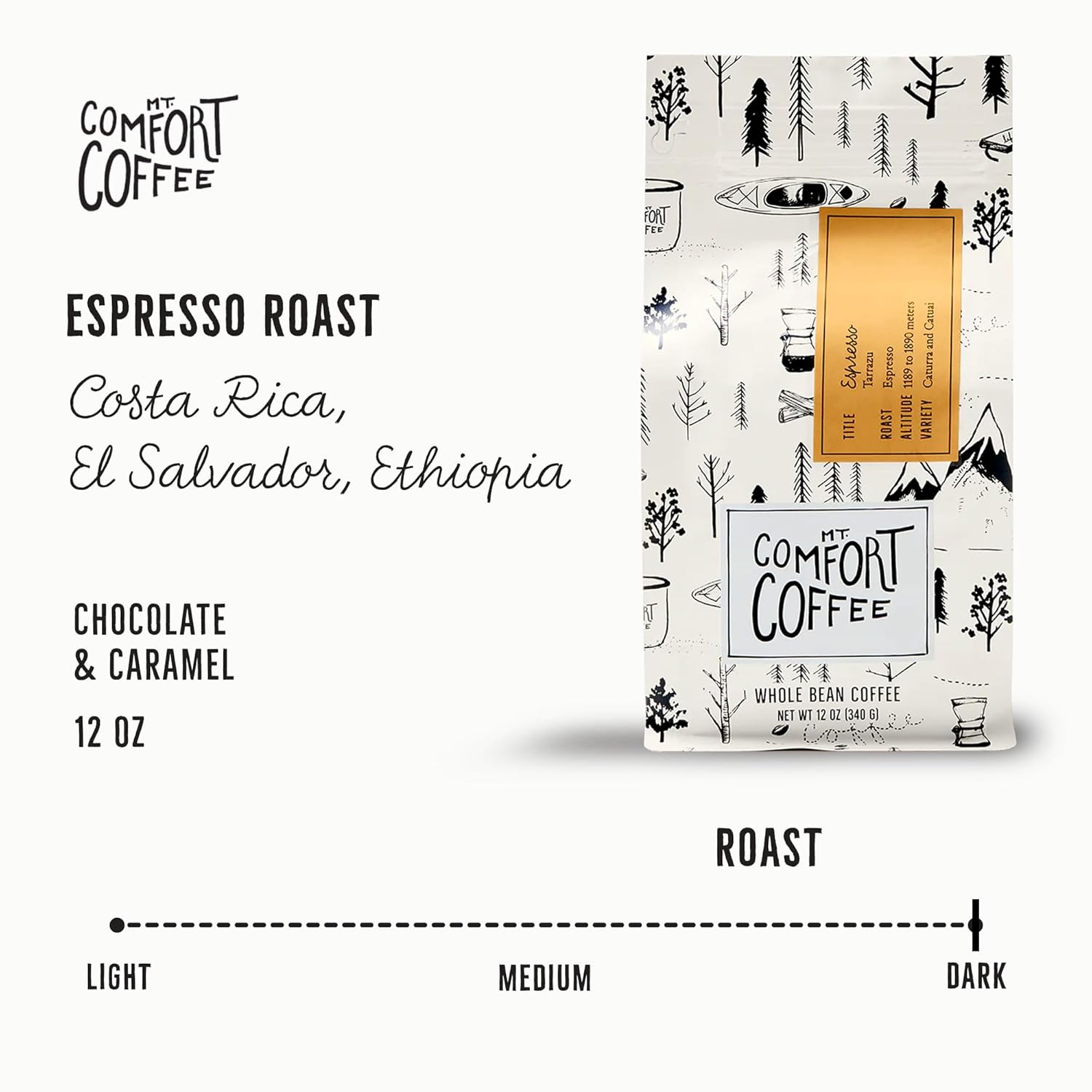 Mt. Comfort Coffee Espresso Roast, 12 Ounce - Flavor Notes of Chocolate & Caramel - Roasted Whole Beans
