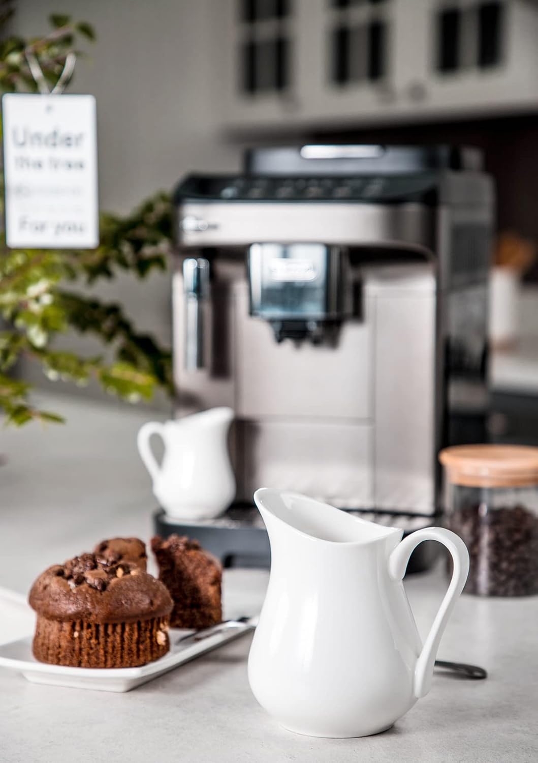 - 🍨 Pitcher Size: The milk pitcher size is 4.15" x4.15" and upgraded big capacity 230ml/8oz set. White pitcher Light weight and mini size easy for home kitchen use and store.