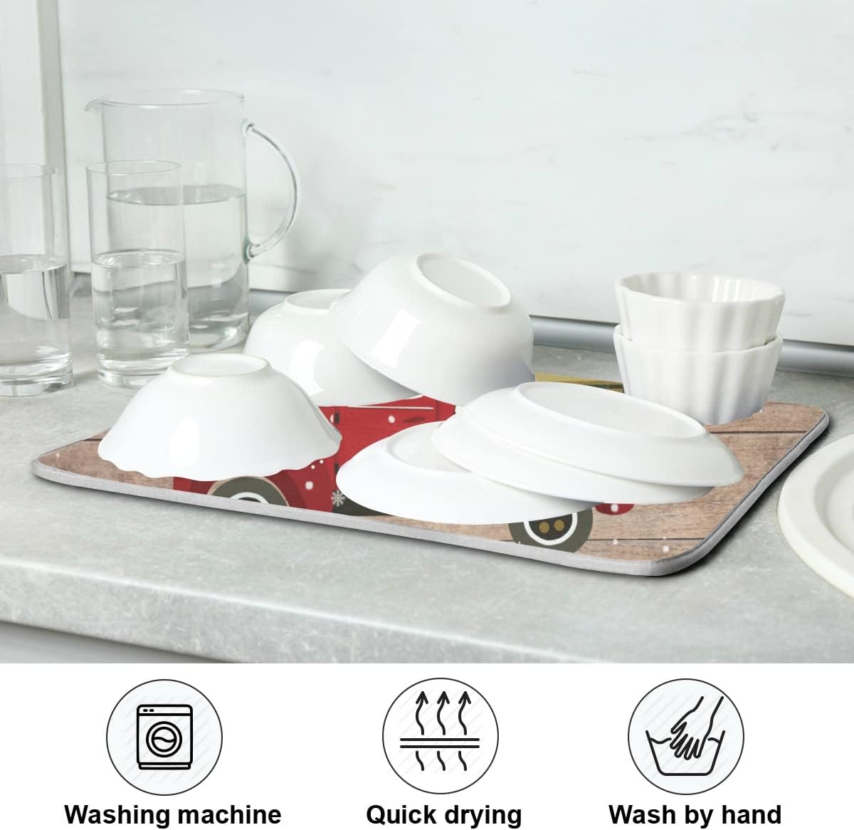 Christmas Dish Drying Mat 18 x 24 Inch with Hanging Loop High Absorbent Reversible Microfiber Red Truck Buffalo Check Plaid Dish Mat Dish Drying Pad Dish Rack Pad Drainer Mat Counter Mat