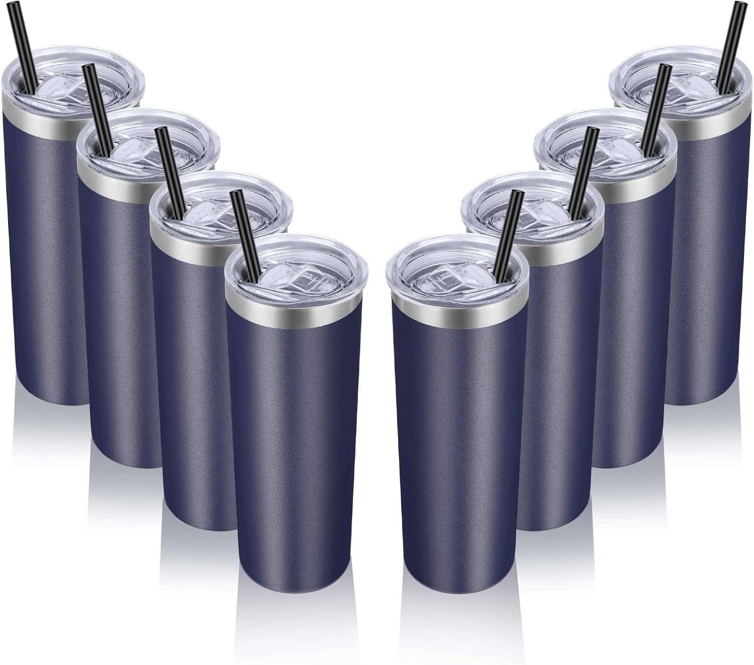 VEGOND Stainless Steel Tumblers Bulk 8 Pack, 20 oz Vacuum Insulated Skinny Tumblers with Lid and Straw, Double Wall Coffee Mug, Travel Water Cup, Navy Blue