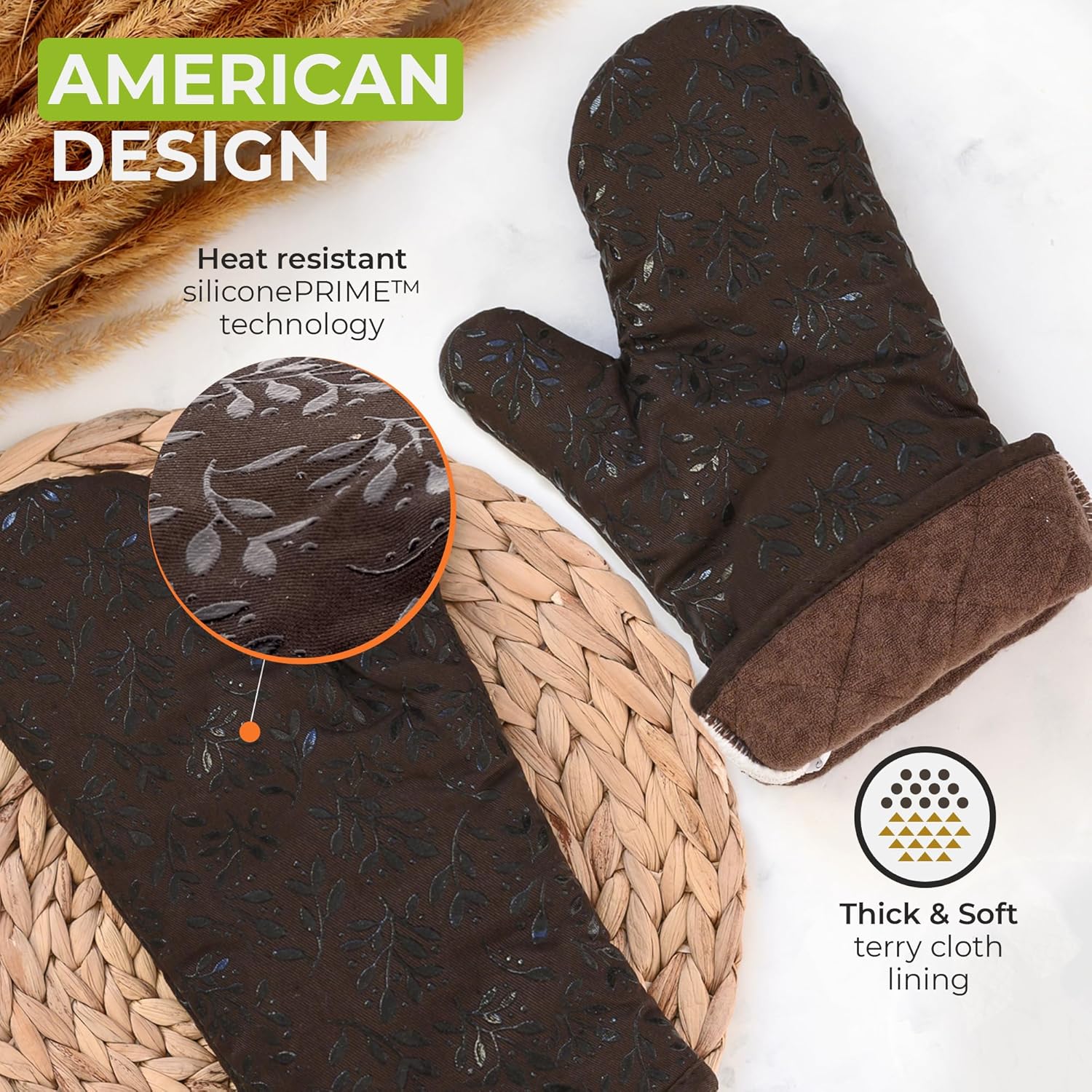 Premium Heat-Resistant Oven Mitts - Stylish and Beautiful - Non-Slip Platinum Silicone Grip - Long and Thick - 100% Natural Cotton Exterior and Soft Terry Cloth Lining - Set of 2 by Cook'n'Chic