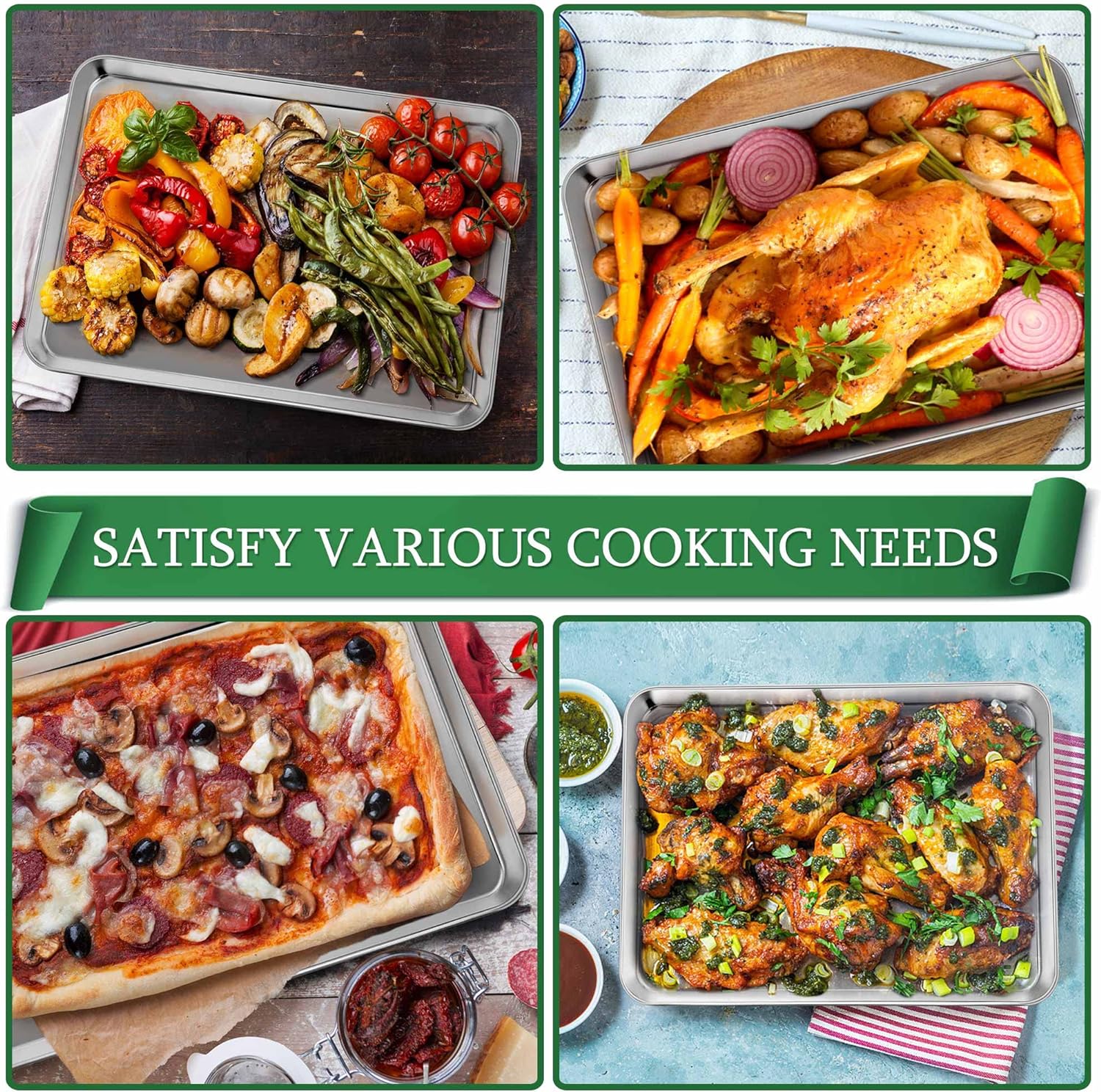- 【MULTIFUNCTIONAL USE】2 Baking trays and 2 baking racks are ideal for baking, roasting or cooling, Using separately or together is on your choice to create endless possibilities of baking, Using together can keep grease on the pan and get crispy food on the rack, To be a perfect bakeware set of home or restaurant, A thoughtful present for family or friends on anniversary, birthday, wedding, or house-warming