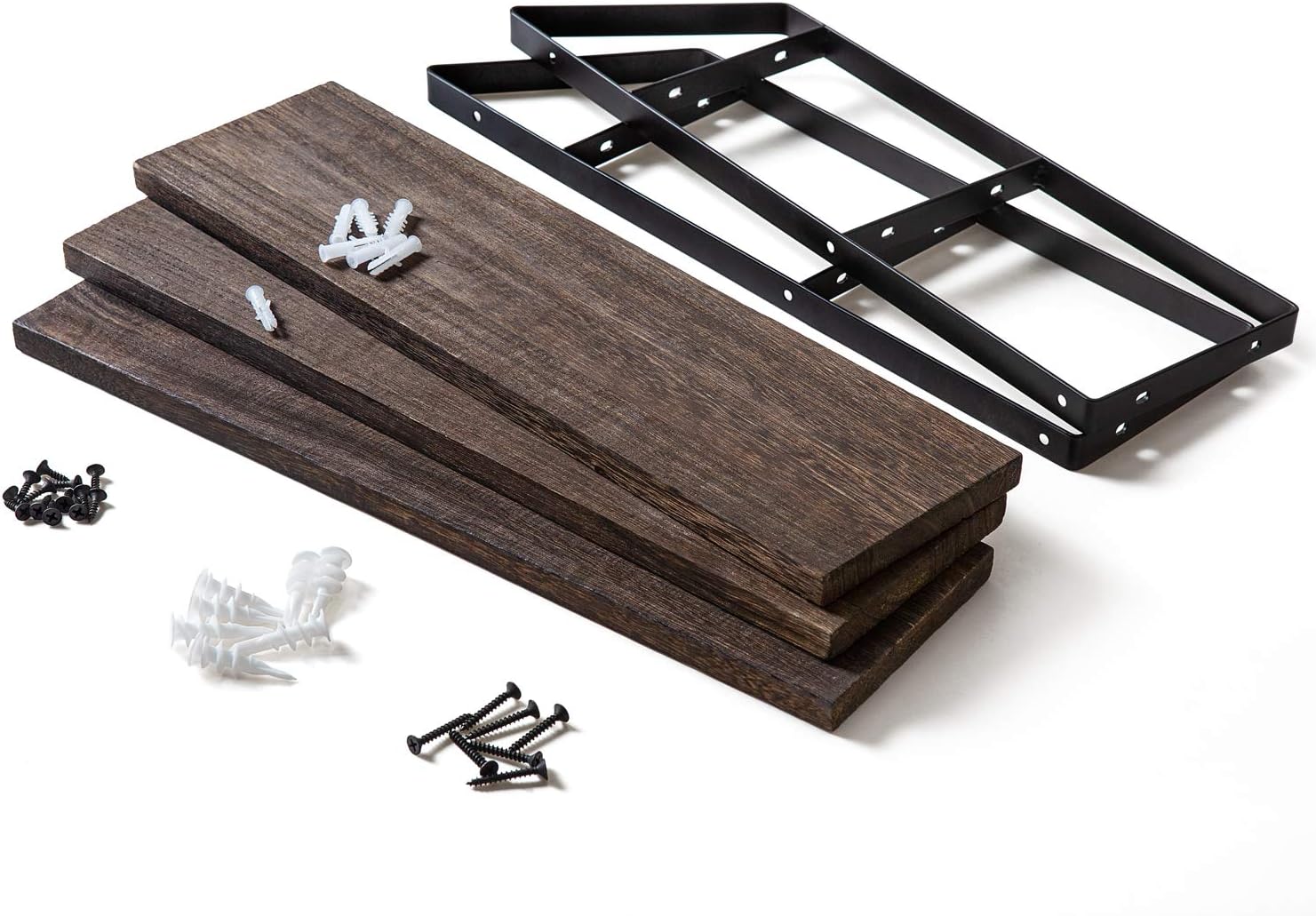 - DURABLE & STYLISH. Features rustic style with paulownia wood and industrial metal brackets, compact 3 tier design, decorative and great addition or accent to any room. Enhance décor and fill in empty wall space above a desk, above toilet, fireplace, entryway, laundry and more