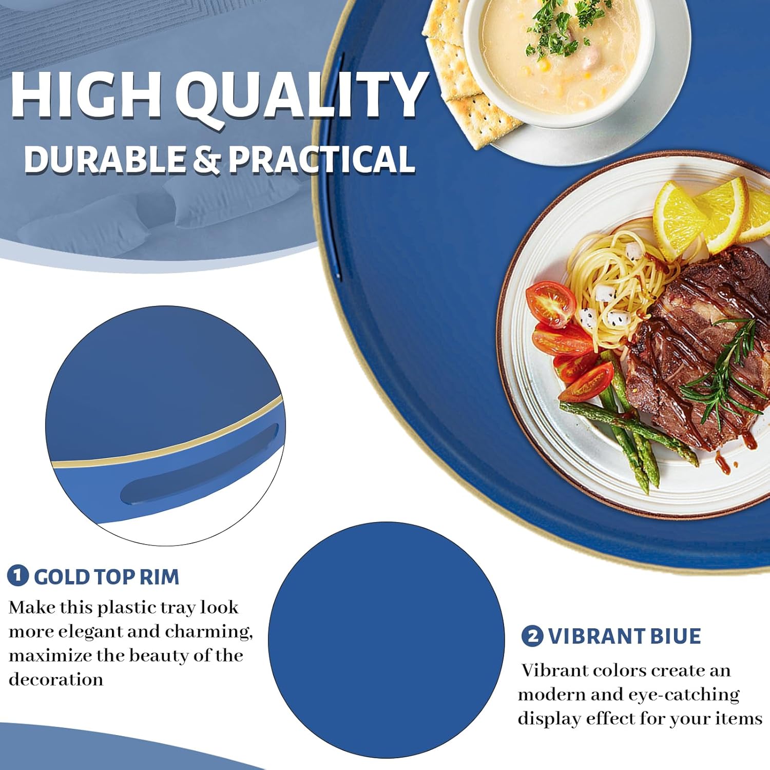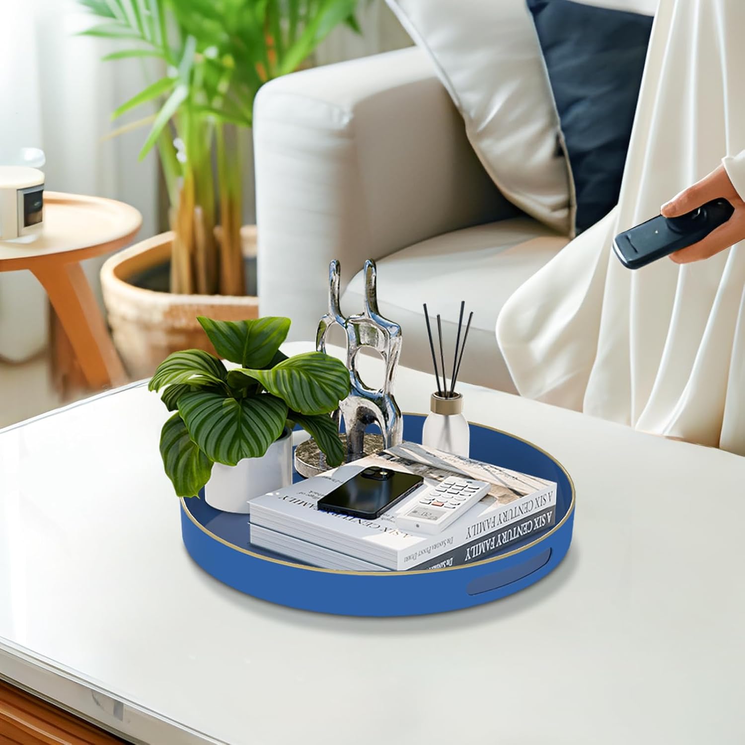 - TRAY DECOR: Blue tray is often used to present food and drinks in an appealing and organized manner. Round table tray can enhance the visual appeal of the items being served, making them more enticing to guests or customers. Also place it on your bathroom vanity as an exquisite showcase for perfumes, jewelry, or bath accessories.