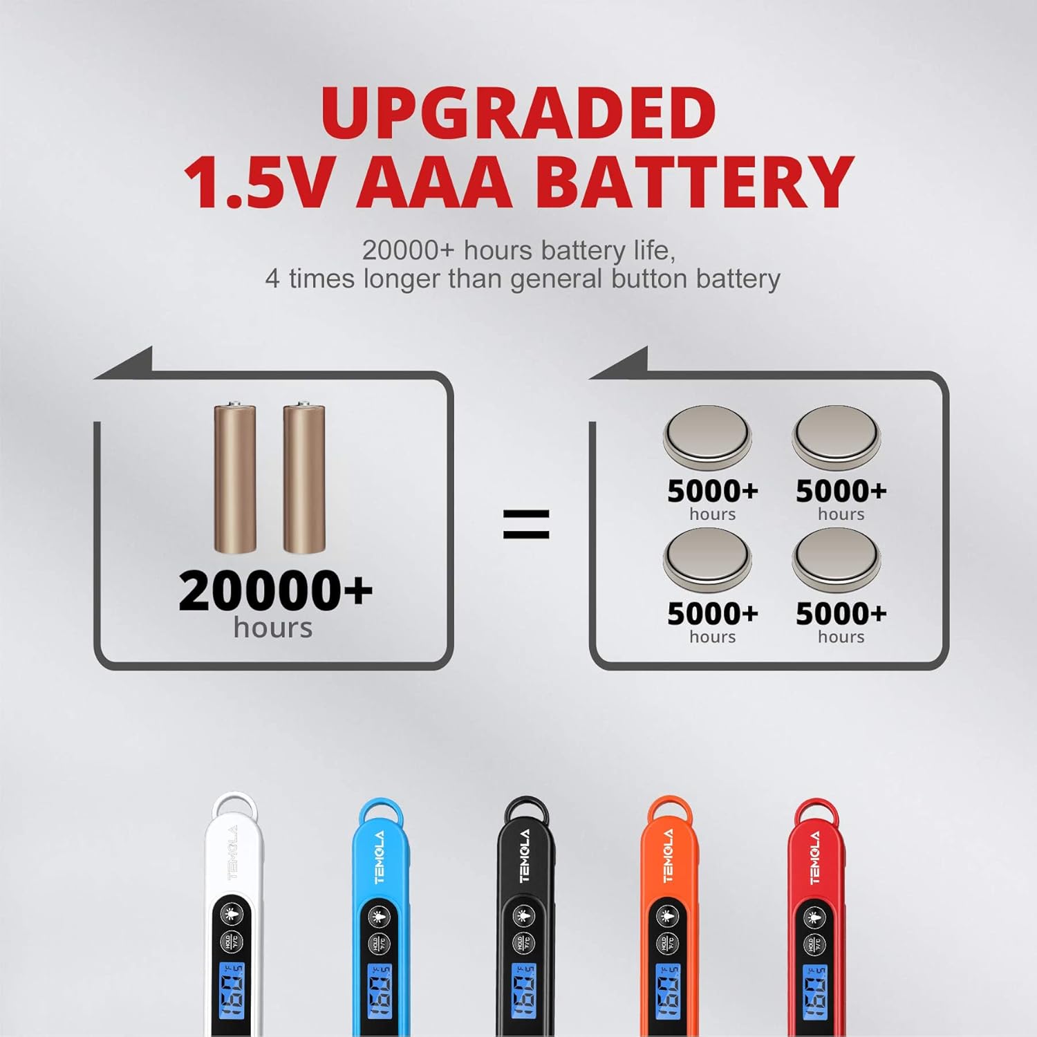 - 【Power Saving & Easy to Use】The food thermometer contains a AAA battery and comes with an extra one. More than 20000+hours battery life allows you to enjoy the cooking thermometer for a whole year. Bright backlight helps to read in the dark.