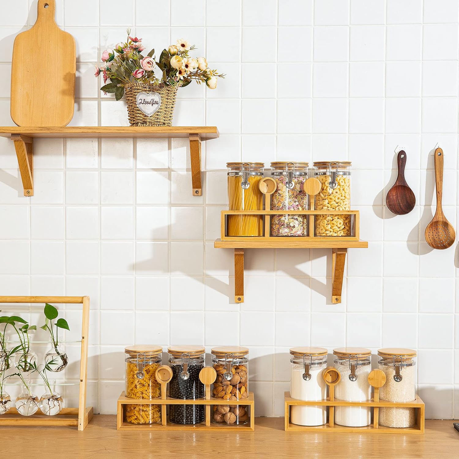 - COFFEE BAR ORGANIZER:There is a bamboo spoon for food scooping. After you use the spoon. And you can put it directly on the bamboo holder without messing up the tabletop.You can also DIY the shelf, hanging on the wall, table corners, etc., used to store pet food.The lid, spoon and stand are the same color which could be a great decor.