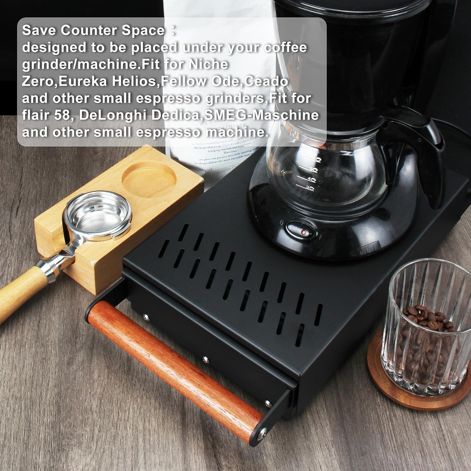 Espresso Knock Box Drawer,Stainless Steel Detachable Coffee Pucks Knock Container, Shock-Absorbent Durable Barista Style Knock Box, Removable Knock Bar,Wood handle and Non-Slip Base (Black)